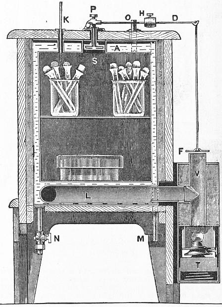 The warm water vessels contain three-quarters of a pint of water and four of them are sufficient to maintain the required temperature, provided that the external air does not fall below 16° C. The vessels are withdrawn and replaced through an entrance to the lower chamber, and which can be opened or closed by a sliding door (D).