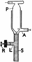 There are several modifications of Reichert’s original form. In one of these the screw arrangement in the lower arm is replaced by a piston rod working in a narrow bore of a vertically bent limb of the arm. In another form, the other end of the cross bar of the T-piece is open and leads through a stopcock to a third arm, which opens into the enlarged upper end of the stem opposite to the outlet arm (A); this modification acts as an adjustable by-pass and replaces the minute aperture in the side of the vertical limb of the T-piece.