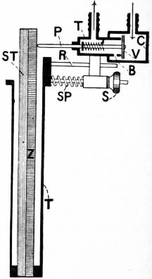The bimetallic thermostat most commonly employed is one of the two forms designed by Dr Roux. In one of these forms the compound bar is straight (fig. 18) and in the other it is U-shaped (fig. 19). In the former type the bar itself is enclosed in a tube (T) of metal, the wall of which is perforated. Towards the open end of this tube the gas box or case (C) is fixed. In the U-shape form it is attached to the outer surface (zinc) of one limb of the bar. The gas box is capable of adjustment with respect to its distance from the bar, by means of a screw (S) and a spiral spring (SP), which moves the box outwards or inwards along a rod (R). This adjustment enables the degree of temperature at which it is desired that the gas shall be cut off to be fixed accurately, and within a certain more or less extended range. The inlet and the outlet pipe are disconnected from each other in the gas box by means of a piston-like rod (P) and valve (V), which slides backwards and forwards in the tubular part (T) of the box, from which the outlet pipe emerges. When the valve (V) rests upon the edge of this box, the gas is completely cut off from passing through the outlet pipe, with the exception of that which passes through an exceedingly small aperture (B), serving as a by-pass. This is just large enough to allow sufficient gas to pass to maintain a small flame. The piston-like rod and valve, when free, is kept pressed outwards by means of a spiral spring. This ensures that the valve shall follow the movements of the compound bar. When this bar bends towards the gas box owing to a fall of temperature, the valve is pushed back away from the orifice and gas in increasing quantity passes through. The temperature of the incubator begins then to rise, and the zinc bar (Z) expanding more than the steel one (ST), the bar bends outwards and the valve once more cuts off the gas supply.
