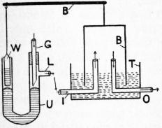 In R. A. Buddicom’s gas regulator (fig. 20) the inlet (I) and outlet (O) gas pipe open into a metal bell (B), the lower and open end of which is immersed beneath water contained in a metal tray (T). The bell is suspended upon the arm of a balance (B) and the other arm is poised by a weight (W). This weight may be made of any convenient material. In the original apparatus a test-tube partially filled with mercury was used. The weight dips into one limb of a U-shaped glass tube (U), which contains mercury. Into the other limb of this tube the gas from the meter enters through a glass tube (G) which is held in position by a well-fitting cork. The internal aperture of the tube (G) is very oblique, and it rests just above the level of the mercury when the instrument is finally adjusted. This adjustment is better made in the morning when the gas pressure in the main is at its lowest. Just above the internal aperture of the tube (G), a lateral tube (L) passes out from the limb of the U and is connected with the inlet pipe (I) of the bell. If the gas pressure rises, the bell (B) is raised and the counter-poising weight (W) is proportionately lowered. This forces the mercury up in the other limb of the U-tube and consequently diminishes the size of the oblique orifice in the tube (G). Some of the gas is thus cut off and the pressure maintained constant. Should the pressure fall, the reverse processes occur, and more gas passes through the orifice of G and consequently to the burner by the outlet tube (O).