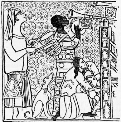KITCHEN (O.E. cycene; this and other cognate forms, such as Dutch keuken, Ger. Küche, Dan. kökken, Fr. cuisine, are formed from the Low Lat. cucina, Lat. coquina, coquere, to cook), the room or place in a house set apart for cooking, in which the culinary and other domestic utensils are kept. The range or cooking-stove fitted with boiler for hot water, oven and other appliances, is often known as a “kitchener” (see Cookery and Heating). Archaeologists have used the term “kitchen-midden,” i.e. kitchen rubbish-heap (Danish kökken-mödding) for the rubbish heaps of prehistoric man, containing bones, remains of edible shell-fish, implements, &c. (see Shell-heaps). “Midden,” in Middle English mydding, is a Scandinavian word, from myg, muck, filth, and dyng, heap; the latter word gives the English “dung.”