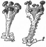 Those leucite rocks which contain abundant essential plagioclase felspar are known as leucite-tephrites and leucite-basanites. The former consist mainly of plagioclase, leucite and augite, while the latter contain olivine in addition. The leucite is often present in two sets of crystals, both porphyritic and as an ingredient of the ground mass. It is always idiomorphic with rounded outlines. The felspar ranges from bytownite to oligoclase, being usually a variety of labradorite; orthoclase is scarce. The augite varies a good deal in character, being green, brown or violet, but aegirine (the dark green pleochroic soda-iron-augite) is seldom present. Among the accessory minerals biotite, brown hornblende, hauyne, iron oxides and apatite are the commonest; melanite and nepheline may also occur. The ground mass of these rocks is only occasionally rich in glass. The leucite-tephrites and leucite-basanites of Vesuvius and Somma are familiar examples of this class of rocks. They are black or ashy-grey in colour, often vesicular, and may contain many large grey phenocysts of leucite. Their black augite and yellow green olivine are also easily detected in hand specimens. From Volcanello, Sardinia and Roccamonfina similar rocks are obtained; they occur also in Bohemia, in Java, Celebes, Kilimanjaro (Africa) and near Trebizond in Asia Minor.
