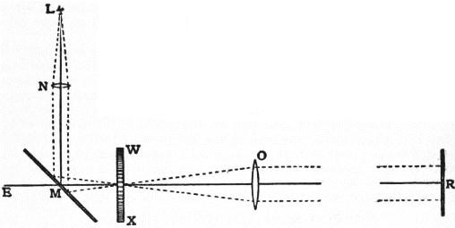 In actual practice it is necessary to interpose the object glass of a telescope at a point O, at a distance from M nearly equal to its focal length. The function of this appliance is to render the diverging rays, shown by the dotted lines, nearly parallel, in order that more light may reach R and be thrown back again. But the principle may be conceived without respect to the telescope, all the rays being ignored except the central one, which passes over the course we have described.