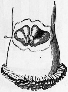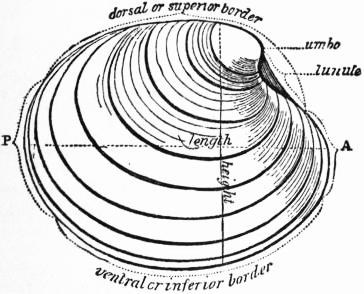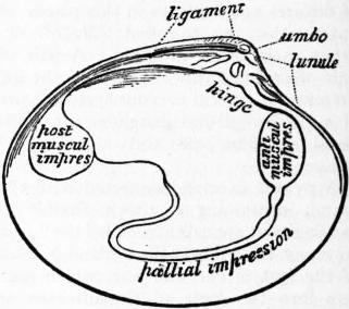 Fam. 2. Ostraeidae.—Foot much reduced and without byssus. Heart usually on the ventral side of the rectum. Gills fused to the mantle. Shell irregular, fixed in the young by the left and larger valve. Ostraea; foot absent in the adult; edible and cultivated; some species, as the British O. edulis, are hermaphrodite.