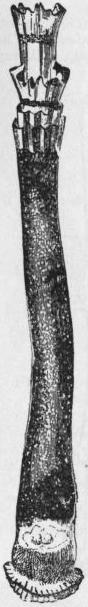 Fam. 5. Hippuritidae.—Fixed valve long, cylindro-conical, with three longitudinal furrows which correspond internally to two pillars for support of the siphons. Hippurites. Arnaudia.