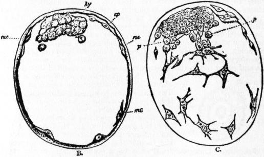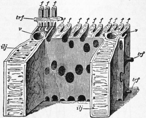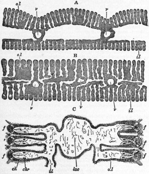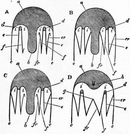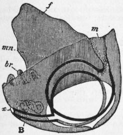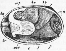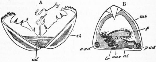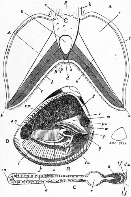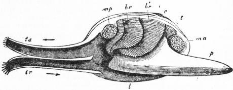 br, br′, Outer and inner gill-plates. t, Labial tentacle. ta, tr, Upper and lower siphons. ms, Siphonal muscle of the mantle-flap. ma, Anterior adductor muscle. mp, Posterior adductor muscle. p, Foot. c, Umbo. |