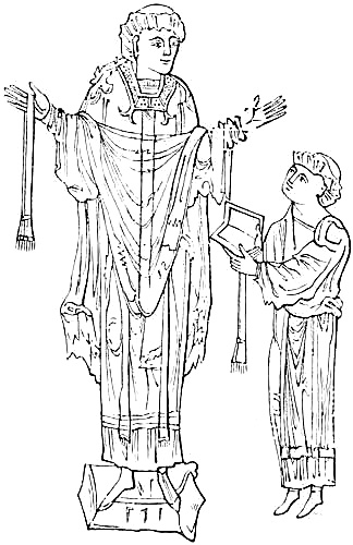 Grandeur of the churches compared with domestic buildings, 184—Furniture of churches, 187, 190—List of necessary things, 189—Clerical vestments: pallium, chasuble, 191; stole, maniple, amice, dalmatic, 192; cope, surplice, 193; amyss, 194—Fanciful symbolism, 196; a bishop in “full canonicals,” 198.