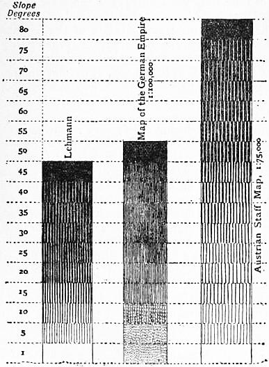 The declivities of the ground are still indicated in most topographical maps by a system of strokes or hachures, first devised by L. Chr. Müller (Plan und Kartenzeichnen, 1788) and J. G. Lehmann, who directed a survey of Saxony, 1780-1806, and published his Theorie der Bergzeichnung in 1799. By this method the slopes are indicated by strokes or hachures crossing the contour lines at right angles, in the direction of flowing water, and varying in thickness according to the degree of declivity they represent (cf. for example, the map of Switzerland in this work). The light is supposed to descend vertically upon the country represented, and in a true scale of shade the intensity increases with the inclination from 0° to 90°; but as such a scale does not sufficiently differentiate the lesser inclinations which are the most important, the author adopted a conventional scale, representing a slope of 45° or more, supposed to be inaccessible, as absolutely black, the level surfaces, which reflect all the light which falls upon them, as perfectly white, and the intervening slopes by a proportion between black and white, as in fig. 2. The main principles of this system have been maintained, but its details have been modified frequently to suit special cases. Thus the French survey commission of 1828 fixed the proportion of black to white at one and a half times the angle of slope; while in Austria, where steep mountains constitute an important feature, solid black has been reserved for a slope of 80°, the proportion of black to white varying from 80 : 0 (for 50°) to 8 : 72 (for 5°). On the map of Germany (1 : 100,000) a slope of 50° is shown in solid black while stippled hachures are used for gentle slopes up to 10°. Instead of shading lines following the greatest slopes, lines following the contours and varying in their thickness and in their intervals apart, according to the slope of the ground to be represented, may be employed. This method affords a ready and expeditious means of sketching the ground, if the draughtsman limits himself to characteristically indicating its features by what have been called “form lines.” This method can be recommended in the case of plotting the results of an explorer’s route, or in the case of countries of which we have no regular survey (cf. the map of Afghanistan in this work).