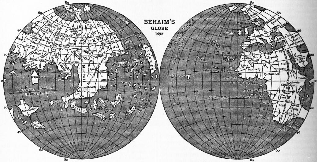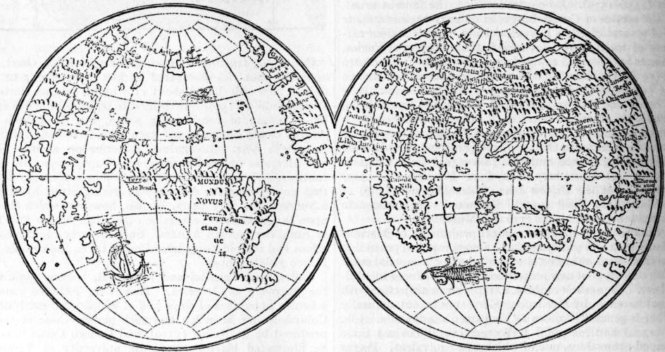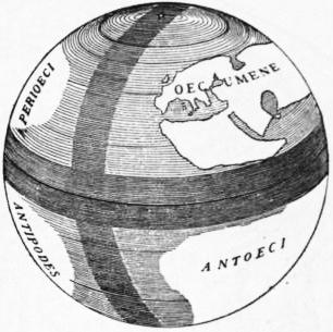 About the same time Crates of Mallus (d. 145 B.C.) embodied the views of the Stoic school of philosophy in a globe which has become typical as one of the insignia of royalty. On this globe an equatorial and a meridional ocean divide our earth into four quarters, each inhabited, thus anticipating the discovery of North and South America and Australia.17