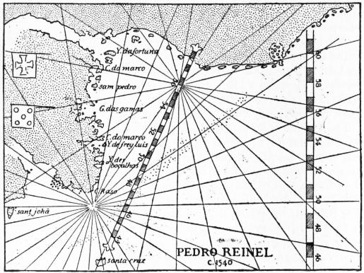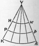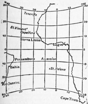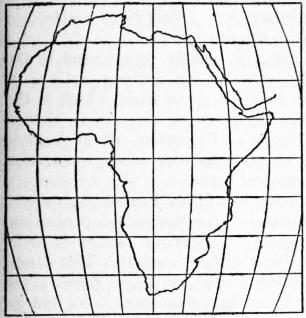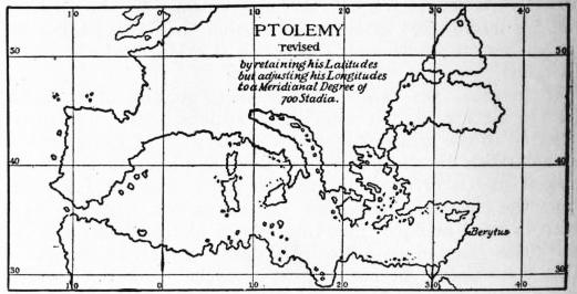 Ptolemy’s great merit consists in having accepted the views of Hipparchus with respect to a projection suited for a map of the world. Of the two projections proposed by him one is a modified conical projection with curved parallels and straight meridians; in the second projection (see fig. 3) both parallels and meridians are curved. The correct relations in the length of degrees of latitude and longitude are maintained in the first case along the latitude of Thule and the equator, in the second along the parallel of Agisymba, the equator and the parallels of Meroe, Syene and Thule. Following Hipparchus he divided the equator into 360° drawing his prime meridian through the Fortunate Islands (Canaries). The 26 special maps are drawn on a rectangular projection. As a map compiler Ptolemy does not take a high rank. In the main he copied Marinus whose work he revised and supplemented in some points, but he failed to realize the peninsular shape of India, erroneously exaggerated the size of Taprobane (Ceylon), and suggested that the Indian Ocean had no connexion with the western ocean, but formed Mare Clausum. Ptolemy knew but of a few latitudes which had been determined by actual observation, while of three longitudes resulting from simultaneous observation of eclipses he unfortunately accepted the least satisfactory, namely, that which placed Arbela 45° to the east of Carthage, while the actual meridian distance only amounts to 34°. An even graver source of error was Ptolemy’s acceptance of a degree of 500 instead of 700 stadia. The extent to which the more correct proportion would have affected the delineation of the Mediterranean is illustrated by fig. 4. But in spite of his errors the scientific method pursued by Ptolemy was correct, and though he was neglected by the Romans and during the middle ages, once he had become known, in the 15th century, he became the teacher of the modern world.