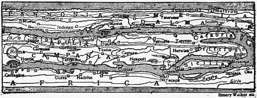 Only two specimens of Roman cartography have come down to us, viz. parts of a plan of Rome, of the time of the emperor 637 Septimius Severus (A.D. 193-211), now in the Museo Capitolino, and an itinerarium scriptum, or road map of the world, compressed within a strip 745 mm. in length and 34 mm. broad. Of its character the reduced copy of one of its 12 sections (fig. 5) conveys an idea. The map, apparently of the 3rd century, was copied by a monk at Colmar, in 1265, who fortunately contented himself with adding a few scriptural names, and having been acquired by the learned Conrad Peutinger of Augsburg it became known as Tabula peutingeriana. The original is now in the imperial library of Vienna.19
