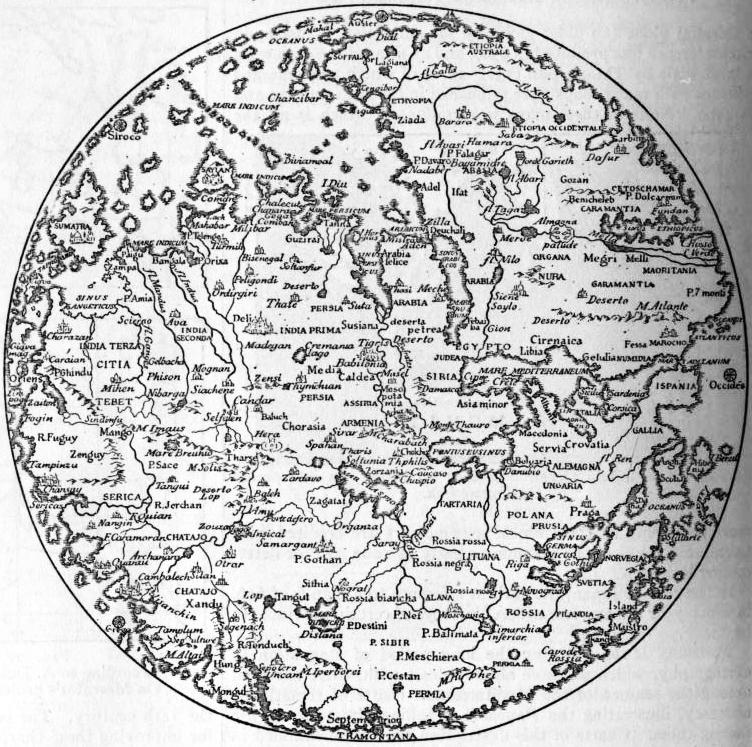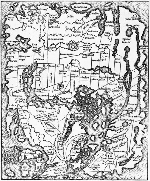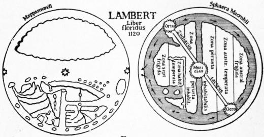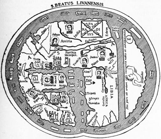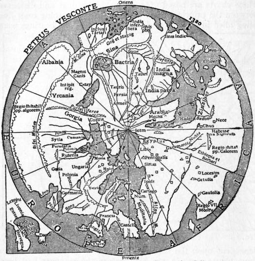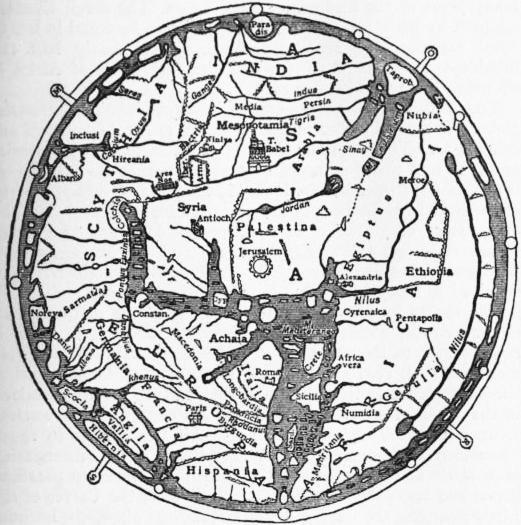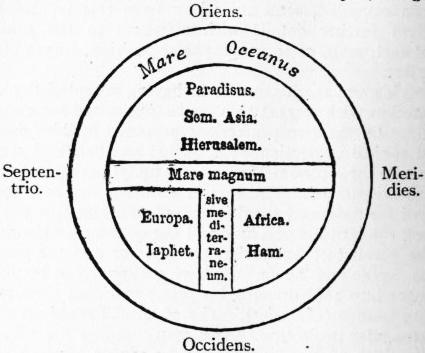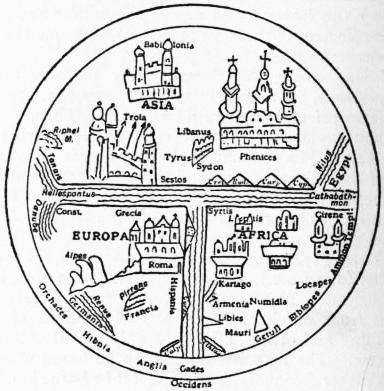 Map-Making in the Middle Ages.—In scientific matters the early middle ages were marked by stagnation and retrogression. The fathers of the church did not encourage scientific pursuits, which Lactantius (4th century) declared to be unprofitable. The doctrine of the sphericity of the earth was still held by the more learned, but the heads of the church held it to be unscriptural. Pope Zachary, when in 741 he condemned the views of Virgilius, the learned bishop of Salzburg, an Irishman who had been denounced as a heretic by St Boniface, declares it to be perversa et iniqua doctrina. Even after Gerbert of Aurillac, better known as Pope Sylvester II. (999-1063), Adam of Bremen (1075), Albertus Magnus (d. 1286), Roger Bacon (d. 1294), and indeed all men of leading had accepted as a fact and not a mere hypothesis the geocentric system of the universe and sphericity of the globe, the authors of maps of the world, nearly all of whom were monks, still looked in the main to the Holy Scriptures for guidance in outlining the inhabited world. We have to deal thus with three types of these early maps, viz. an oblong rectangular, a circular and an oval type, the latter being either a compromise between the two former, or an artistic development of the circular type. In every instance the inhabited world is surrounded by the ocean. The authors of rectangular maps look upon the Tabernacle as an image of the world at large, and believe that such expressions as the “four corners of the earth” (Isa. x. 12), could be reconciled only with a rectangular world. On the other hand there was the expression “circuit of the earth” (Isa. xl. 22), and the statement (Ezek. v. 5) that “God had set Jerusalem in the midst of the nations and countries.” In 638 nearly every case the East occupies the top of the map. Neither parallels nor meridians are indicated, nor is there a scale. Other features frequently met with are the Paradise in the Far East, miniatures of towns, plants, animals, human beings and monsters, and an indication of the twelve winds around the margin.