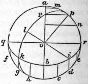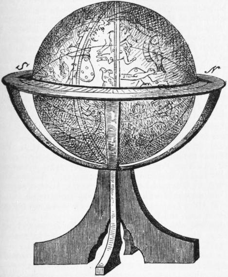 Larger globes are usually on a stand the top of which supports an artificial horizon. The globe itself rotates within a metallic meridian to which its axis is attached. Other accessories are an hour-circle, around the north pole, a compass placed beneath the globe, and a flexible quadrant used for finding the distances between places. These accessories are indispensable if it be proposed to solve the problems usually propounded in books on the “use of the globes,” but can be dispensed with if the globe is to serve only as a map of the world. The size of a globe is usually given in terms of its diameter. To find its scale divide the mean diameter of the earth (1,273,500 m.) by the diameter of the globe; to find its circumference multiply the diameter by π (3.1416).