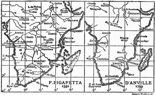 Chorographical (Gr. χώρα, country or region) and general maps are either reduced from topographical maps or compiled from such miscellaneous sources as are available. In the former case the cartographer is merely called upon to reduce and generalize the information given by his originals, to make a judicious selection of place names, and to take care that the map is not overcrowded with names and details. Far more difficult is his task where no surveys are available, and the map has to be compiled from a variety of sources. These materials generally include reconnaissance survey of small districts, route surveys and astronomical observations supplied by travellers, and information obtained from native sources. The compiler, in combining these materials, is called upon to examine the various sources of information, and to form an estimate of their value, which he can only do if he have himself some knowledge of surveying and of the methods of determining positions by astronomical observation. A knowledge of the languages in which the accounts of travellers are written, and even of native languages, is almost indispensable. He ought not to be satisfied with compiling his map from existing maps, but should subject each explorer’s account to an independent examination, when he will frequently find that either the explorer himself, or the draughtsman employed by him, has failed to introduce into his map the whole of the information available. Latitudes from the observations of travellers may generally be trusted, but longitudes should be accepted with caution; for so competent an observer as Captain Speke placed the capital of Uganda in longitude 32° 44′ E., when its true longitude as determined by more trustworthy observations is 32° 26′ E., an error of 18′. Again, on the map illustrating Livingstone’s “Last Journals” the Luapula is shown as issuing from the Bangweulu in the north-west, when an examination of the account of the natives who carried the great explorer’s remains to the coast would have shown that it leaves that lake on the south.
