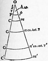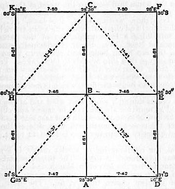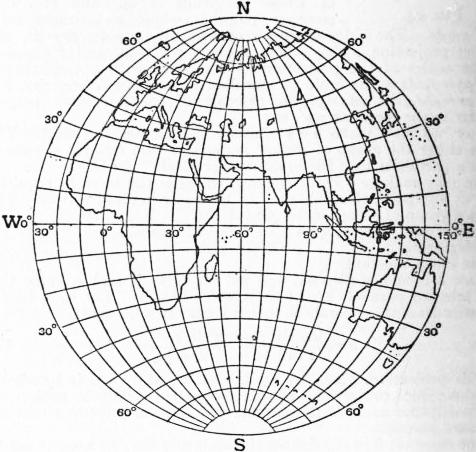 Measurement of Distance.—The shortest distance between two places on the surface of a globe is represented by the arc of a great circle. If the two places are upon the same meridian or upon the equator the exact distance separating them is to be found by reference to a table giving the lengths of arcs of a meridian and of the equator. In all other cases recourse must be had to a map, a globe or mathematical formula. Measurements made on a topographical map yield the most satisfactory results. Even a general map may be trusted, as long as we keep within ten degrees of its centre. In the case of more considerable distances, however, a globe of suitable size should be consulted, or—and this seems preferable—they should be calculated by the rules of spherical trigonometry. The problem then resolves itself in the solution of a spherical triangle.