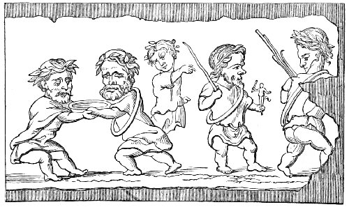 In Greece, however, the spirit of caricature and burlesque representation had assumed a more regular form than in other countries, for it was inherent in the spirit of Grecian society. Among the population of Greece, the worship of Dionysus, or Bacchus, had taken deep root from a very early period—earlier than we can trace back—and it formed the nucleus of the popular religion and superstitions, the cradle of poetry and the drama. The most popular celebrations of the people of Greece, were the Dionysiac festivals, and the phallic rites and processions which accompanied them, in which the chief actors assumed the disguise of satyrs and fawns, covering themselves with goat-skins, and disfiguring their faces by rubbing them over with the lees of wine. Thus, in the guise of noisy bacchanals, they displayed an unrestrained licentiousness of gesture and language, uttering indecent jests and abusive speeches, in which they spared nobody. This portion of the ceremony was the especial attribute of a part of the performers, who accompanied the procession in waggons, and acted something like dramatic performances, in which they uttered an abundance of loose extempore satire on those who passed or who accompanied the procession, a little in the style of the modern carnivals. It became thus the occasion for an unrestrained publication of coarse pasquinades. In the time of Pisistratus, these performances are assumed to have been reduced to a little more order by an individual named Thespis, who is said to have invented masks as a better disguise than dirty faces, and is looked upon as the father of the Grecian drama. There can be no doubt, indeed, that the drama arose out of these popular ceremonies, and it long bore the unmistakable marks of its origin. Even the name of tragedy has nothing tragic in its derivation, for it is formed from the Greek word tragos (τράγος), a goat, in the skins of which animal the satyrs clothed themselves, and hence the name was given also to those who personated the satyrs in the processions. A tragodus (τραγῳδὸς) was the singer, whose words accompanied the movements of a chorus of satyrs, and the term tragodia was applied to his performance. In the same manner, a comodus (κωμωδὸς) was one who accompanied similarly, with chants of an abusive or satirical character, a comus (κῶμος), or band of revellers, in the more riotous and licentious portion of the performances in the Bacchic festivals. The Greek drama always betrayed its origin by the circumstance that the performances took place annually, only at the yearly festivals in honour of Bacchus, of which in fact they constituted a part. Moreover, as the Greek drama became perfected, it still retained from its origin a triple division, into tragedy, comedy, and the satiric drama; and, being still performed at the Dionysiac festival in Athens, each dramatic author was expected to produce what was called a trilogy, that is, a tragedy, a satirical play, and a comedy. So completely was all this identified in the popular mind with the worship of Bacchus, that, long afterwards, when even a tragedy did not please the audience by its subject, the common form of disapproval was, τί ταῦτα πρὸς τὸν Διόνυσον—“What has this to do with Bacchus?” and, οὐδὲν πρὸς τὸν Διόνυσον—“This has nothing to do with Bacchus.”