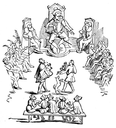 [38] People in the middle ages were so fully conscious of the identity of the mediæval jougleur with the Roman mimus, that the Latin writers often use mimus to signify a jougleur, and the one is interpreted by the others in the vocabularies. Thus, in Latin-English vocabularies of the fifteenth century, we have—