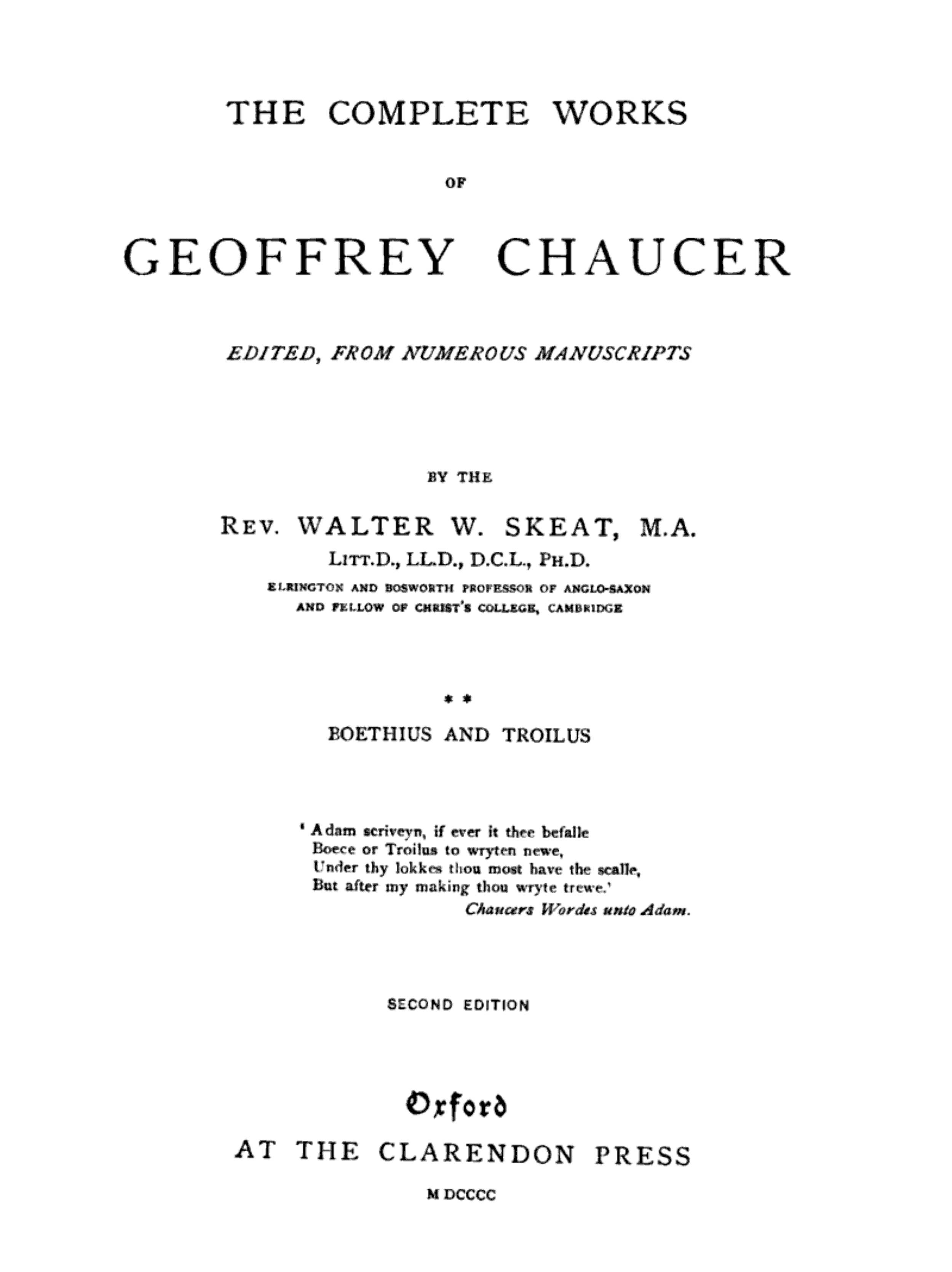 In my introductory remarks to the Legend of Good Women, I refer to the close connection that is easily seen to subsist between Chaucer's translation of Boethius and his Troilus and Criseyde. All critics seem now to agree in placing these two works in close conjunction, and in making the prose work somewhat the earlier of the two; though it is not at all unlikely that, for a short time, both works were in hand together. It is also clear that they were completed before the author commenced the House of Fame, the date of which is, almost certainly, about 1383-4. Dr. Koch, in his Essay on the Chronology of Chaucer's Writings, proposes to date 'Boethius' about 1377-8, and 'Troilus' about 1380-1. It is sufficient to be able to infer, as we can with tolerable certainty, that these two works belong to the period between 1377 and 1383. And we may also feel sure that the well-known lines to Adam, beginning—