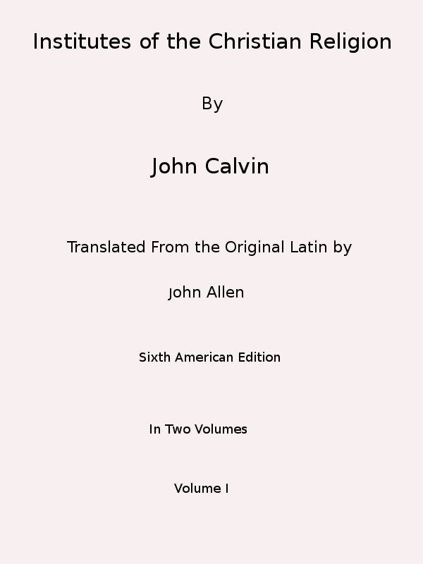 The Board of Publication have been induced to undertake this edition, by the very generous offer of the First and Second Presbyterian Churches in Baltimore, of which the Rev. John Backus and the Rev. Dr. R. J. Breckinridge are respectively Pastors, to defray the expense of stereotyping the work. Under the direction of the Executive Committee of the Board, the translation has been diligently compared throughout with the original Latin and French, and various corrections have been made to convey the meaning of the author more distinctly and accurately. This laborious duty has been performed by a member of the Publishing Committee. The intrinsic excellence of the work, taken in connection with the attractive style, and comparative cheapness, of the present edition, induces the Committee to hope, that it may be widely circulated and carefully studied, both by the clergy and laymen of the Presbyterian Church.