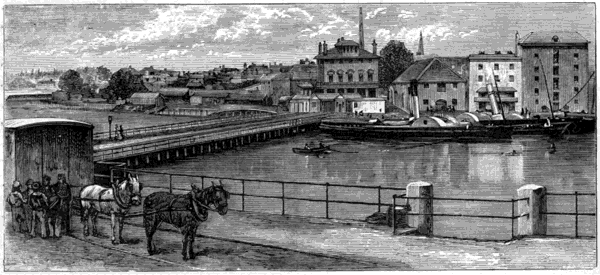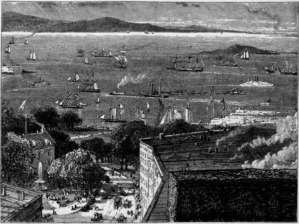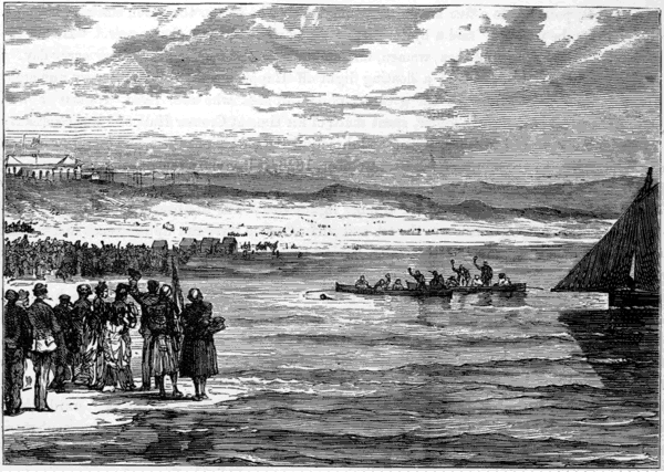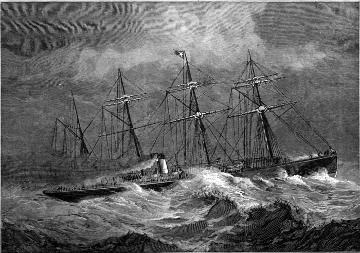 The passage across the “Great Atlantic Ferry” is now one of ease, and in the case of first-class passengers almost luxury. How different was it about forty years ago, even on the best steamships of that period! Charles Dickens has graphically described his experiences on board the Britannia, one of the earliest of the Cunard fleet, in one of his least-read works4—at least in the present generation. The little cupboard dignified by the name of “state-room;” the dingy saloon likened “to a gigantic hearse with windows in the sides;” the melancholy stove at which the forlorn stewards were rubbing their hands; the stewardess, whom Dickens blesses “for her piously fraudulent account of January voyages;” the excitement before leaving the dock; the captain’s boat and the dapper little captain; the last late mail bags, and the departure, are all sketched from nature, as the great novelist alone could depict them. And now they are off.