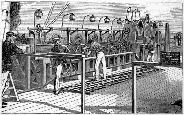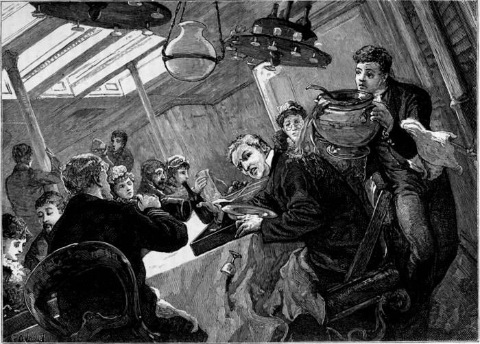 What a difference to the accommodations and comfort of most modern steamships, with their luxurious saloons placed amidships, where there is least motion; their spacious and airy state-rooms, warmed by steam, water laid on, and fitted with electric bells; their music-room with piano and harmonium, their smoking-room, bath-rooms, library, and even barber’s shop. The table is as well served as at the best hotel ashore, and the menu for the day is as extensive as that of a first-class restaurant, while everything that may be required in the drinkables, from modest bottled beer to rare old wine, is to be obtained from the steward. And provided that the passengers assimilate reasonably well, there will be enjoyable games, music, and possibly private theatricals and other regularly organised entertainments. The idea of a “Punch and Judy” in the middle of the Atlantic seems rather funny; but we have known of an instance in which even this form of amusement has been provided on board a great steamship! On long voyages it is not by any means uncommon for some one to start a MS. daily or weekly journal, to which many of the passengers contribute. Such have often been published afterwards for private circulation, as affording reminiscences of a pleasant voyage.