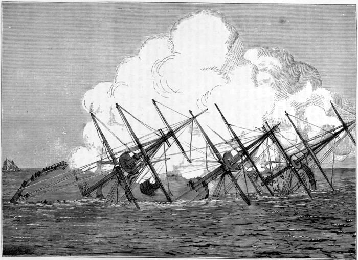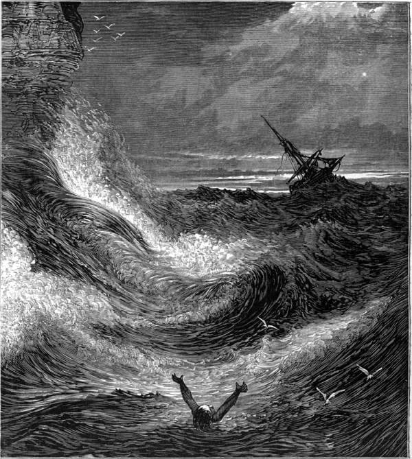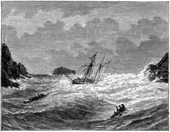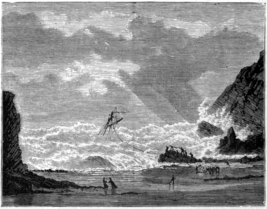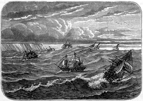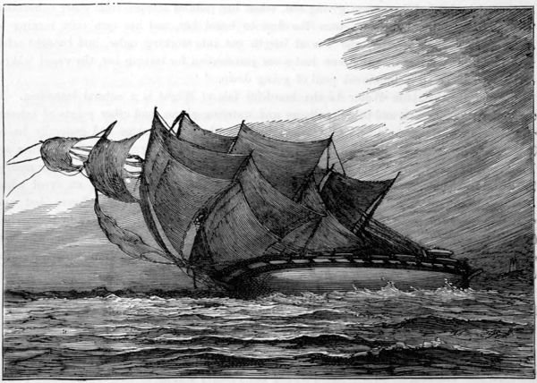 “Before it is possible to make any arrangement at all compatible with this novel state of things the ship rights. Before one can say ‘Thank Heaven!’ she wrongs again. Before one can cry she is wrong, she seems to have started forward, and to be a creature actively running of its own accord, with broken knees and failing legs, through every variety of [pg 8]hole and pitfall, and stumbling constantly. * * * And so she goes on staggering, heaving, wrestling, leaping, diving, jumping, pitching, throbbing, rolling, and rocking, and going through all these movements sometimes by turns, and sometimes all together, until one feels disposed to roar for mercy.”