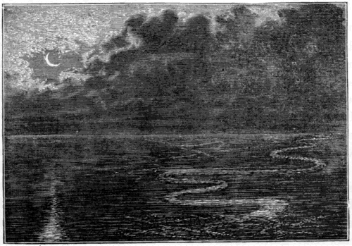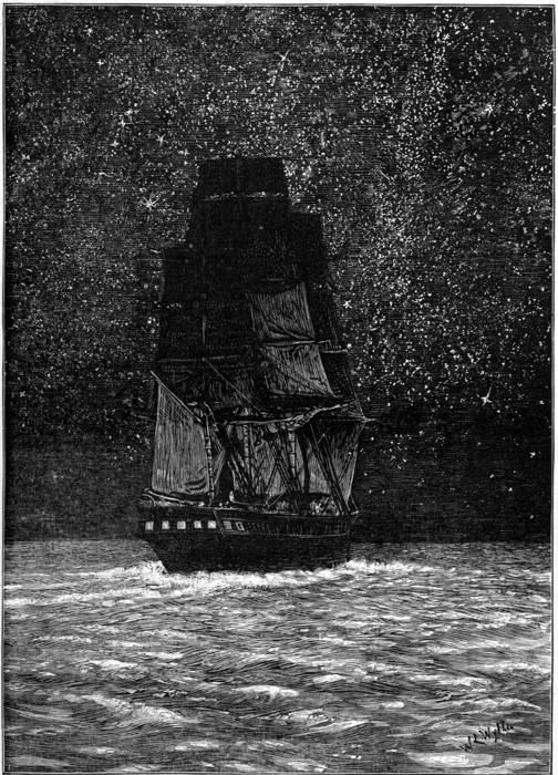 “To one accustomed to such scenes,” says he, “this is a very striking time on shipboard. Afterwards, and when its novelty had long worn off, it never ceased to have a peculiar interest and charm for me. The gloom through which the great black mass holds its direct and certain course; the rushing water, plainly heard, but dimly seen; the broad white glistening track that follows in the vessel’s wake; the men on the look-out forward, who would be scarcely visible against the dark sky but for their blotting out some score of glistening stars; the helmsman at the wheel, with the illuminated card before him shining, a speck of light amidst the darkness, like something sentient and of Divine intelligence; the melancholy sighing of the wind through block and rope and chain; the gleaming forth of light from every crevice, nook, and tiny piece of glass about the decks, as though the ship were filled with fire in hiding, ready to burst through any outlet, wild with its resistless power of death and ruin.”
