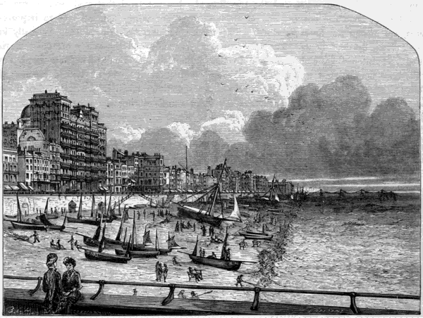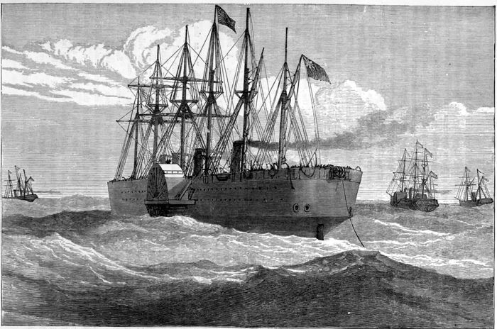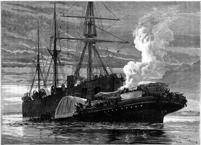 The great steamships of most lines running to distant foreign parts are comparatively easy and steady in their motions, and there is really more chance of being attacked by the mal de mer on an English or Irish Channel boat than there is on the voyage across the Atlantic. The waves in such channels are more cut up and “choppy” than are those of the broad ocean. The employment of the twin-boat, Calais-Douvres, has mitigated much of the horrors of one of our Channel lines. It is curious to note the fact that Indians often use a couple of canoes in very much the same manner as did the designer of the doubled-hulled vessel just mentioned. The writer has seen, in the Straits of Fuca, natives conveying all their possessions on the top of planks, placed over and lashed to two canoes. One suggestion for the improvement of the steamboat service across the Channel to France is to construct an enormous vessel, 650 feet long and 150 wide, a ship as long as the Great Eastern and twice her beam, to be propelled by both paddles and screws. She is to be capable of carrying several trains, and is to have a roofed station on board, with all the necessary saloons. Floating platforms are to connect this great steam ferry-boat with the shore rails, so that it can start or arrive at any time of the tide.