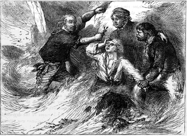Dickens gives a droll account of a ridiculous situation in which he was placed. “About midnight we shipped a sea, which forced its way through the skylights, burst open the doors above, and came raging and roaring down into the ladies’ cabin, to the unspeakable consternation of my wife and a little Scotch lady—who, by the way, had previously sent a message to the captain by the stewardess, requesting him, with her compliments, to have a steel conductor immediately attached to the top of every mast and to the chimney, in order that the ship might not be struck by lightning. They and the handmaid before-mentioned, being in such ecstasies of fear that I scarcely knew what to do with them, I naturally bethought myself of some restorative or comfortable cordial; and nothing better occurring to me at the moment than hot brandy-and-water, I procured a tumblerful without delay. It being impossible to stand or sit without holding on, they were all heaped together in one corner of a long sofa—a fixture extending entirely across the cabin—where they clung to each other, in momentary expectation of being drowned. When I approached this place with my specific, and was about to administer it, with many consolatory expressions, to the nearest sufferer, what was my dismay to see them all roll slowly down to the other end! And when I staggered to that end, and held out the glass once more, how immensely baffled were my good intentions by the ship giving another lurch, and their all rolling back again! I suppose I dodged them up and down this sofa for at least a quarter of an hour, without reaching them once; and by the time I did catch them the brandy-and-water was diminished by constant spilling to a tea-spoonful.”