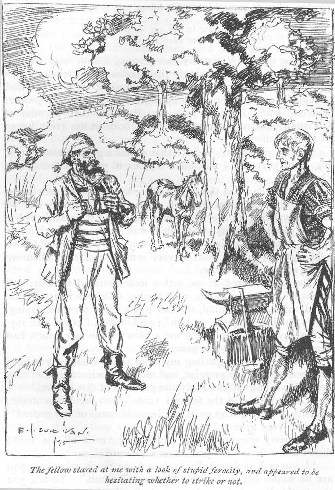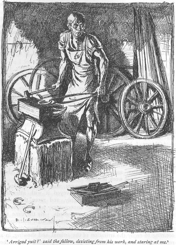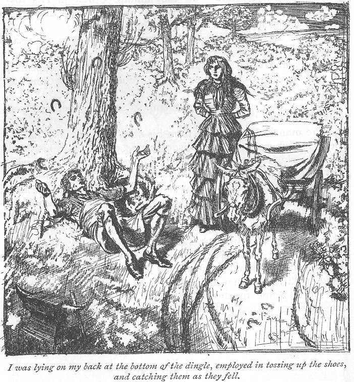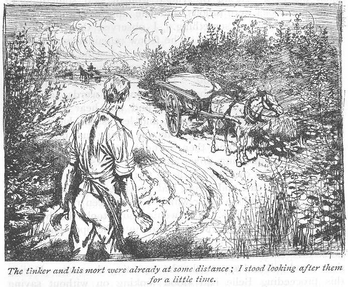 ‘And in order that you may be no longer puzzled with respect to myself,’ said I; ‘I will give you a brief outline of my history. I am the son of honourable parents, who gave me a first-rate education, as far as literature and languages went, with which education I endeavoured, on the death of my father, to advance myself to wealth and reputation in the big city; but failing in the attempt, I conceived a disgust for the busy world, and determined to retire from it. After wandering about for some time, and meeting with various adventures, in one of which I contrived to obtain a pony, cart, and certain tools used by smiths and tinkers, I came to this place, where I amused myself with making horse-shoes, or rather pony-shoes, having acquired the art of wielding the hammer and tongs from a strange kind of smith—not him of Gretna Green—whom I knew in my childhood. And here I lived, doing harm to no one, quite lonely and solitary, till one fine morning the premises were visited by this young gentlewoman and her companions. She did herself anything but justice when she said that her companions quarrelled with her because she would not side with them against me; they quarrelled with her because she came most heroically to my assistance as I was on the point of being murdered; and she forgot to tell you that, after they had abandoned her, she stood by me in the—dark hour, comforting and cheering me, when unspeakable dread, to which I am occasionally subject, took possession of my mind. She says she is nothing to me, even as I am nothing to her. I am of course nothing to her, but she is mistaken in thinking she is nothing to me. I entertain the highest regard and admiration for her, being convinced that I might search the whole world in vain for a nature more heroic and devoted.’