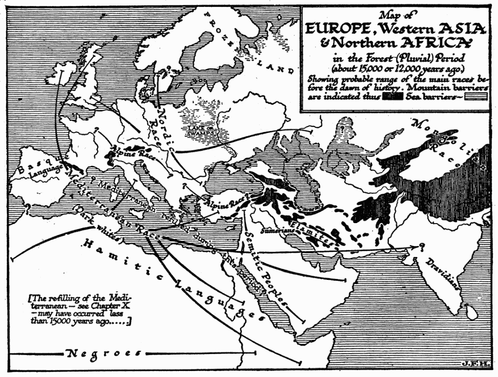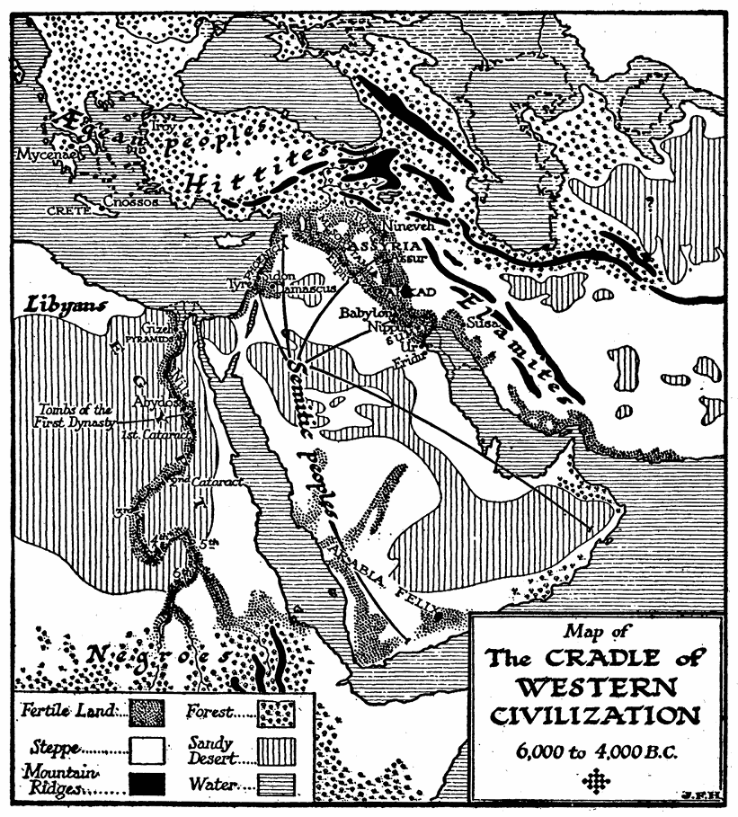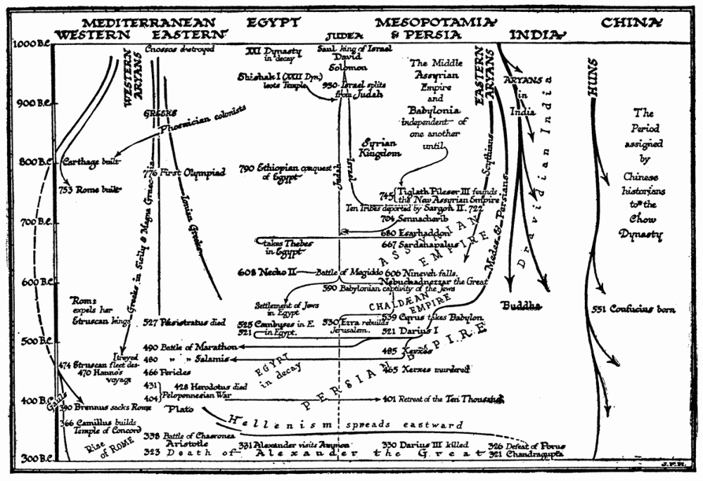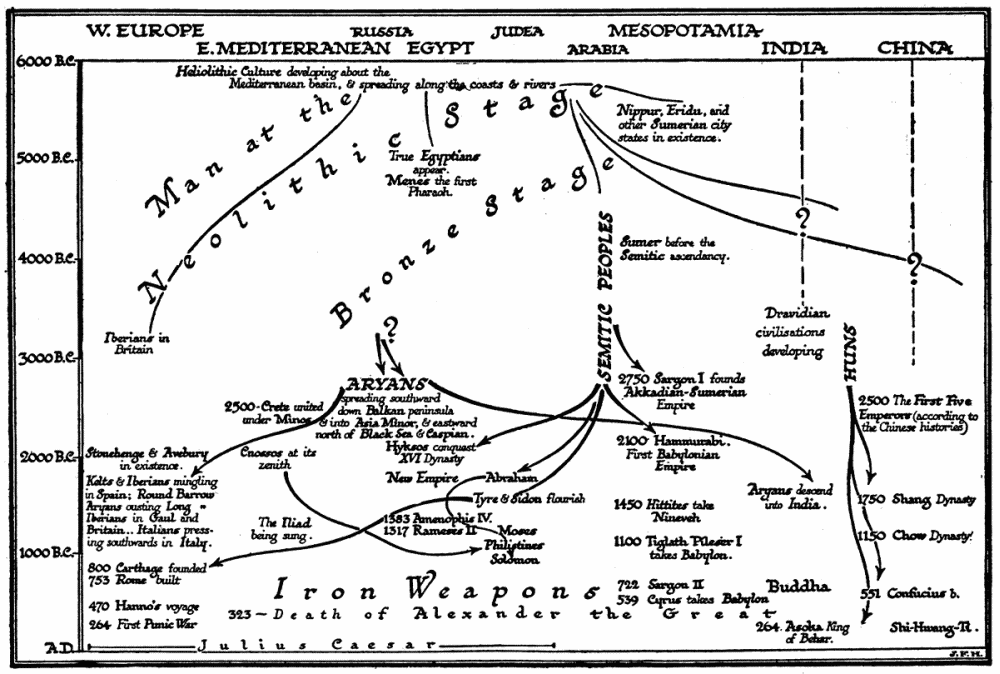 Remarkably few sketches of universal history by one single author have been written. One book that has influenced the writer very strongly is Winwood Reade’s Martyrdom of Man. This dates, as people say, nowadays, and it has a fine gloom of its own, but it is still an extraordinarily inspiring presentation of human history as one consistent process. Mr. F. S. Marvin’s Living Past is also an admirable summary of human progress. There is a good General History of the World in one volume by Mr. Oscar Browning. America has recently produced two well-illustrated and up-to-date class books, Breasted’s Ancient Times and Robinson’s Medieval and Modern Times, which together give a very good idea of the story of mankind since the beginning of human societies. There are, moreover, quite a number of nominally Universal Histories in existence, but they are really not histories at all, they are encyclopædias of history; they lack the unity of presentation attainable only when the whole subject has been passed through one single mind. These universal histories are compilations, assemblies of separate national or regional histories by different hands, the parts being necessarily unequal in merit and authority and disproportionate one to another. Several such universal histories in thirty or forty volumes or so, adorned with allegorical title pages and illustrated by folding maps and plans of Noah’s Ark, Solomon’s Temple, and the Tower of Babel, were produced for the libraries of gentlemen in the eighteenth century. Helmolt’s World History, in eight massive volumes, is a modern compilation of the same sort, very useful for reference and richly illustrated, but far better in its parts than as a whole. Another such collection is the Historians’ History of the World in 25 volumes. The Encyclopædia Britannica contains, of course, a complete encyclopædia of history within itself, and is the most modern of all such collections.[1] F. Ratzel’s History of Mankind, in spite of the promise of its title, is mainly a natural history of man, though it is rich with suggestions upon the nature and development of civilization. That publication and Miss Ellen Churchill Semple’s Influence of Geographical Environment, based on Ratzel’s work, are quoted in this Outline, and have had considerable influence upon its plan. F. Ratzel would indeed have been the ideal author for such a book as our present one. Unfortunately neither he nor any other ideal author was available.[2]