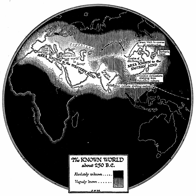 The writer will offer no apology for making this experiment. His disqualifications are manifest. But such work needs to be done by as many people as possible, he was free to make his contribution, and he was greatly attracted by the task. He has read sedulously and made the utmost use of all the help he could obtain. There is not a chapter that has not been examined by some more competent person than himself and very carefully revised. He has particularly to thank his friends Sir E. Ray Lankester, Sir H. H. Johnston, Professor Gilbert Murray, and Mr. Ernest Barker for much counsel and direction and editorial help. Mr. Philip Guedalla has toiled most efficiently and kindly through all the proofs. Mr. A. Allison, Professor T. W. Arnold, Mr. Arnold Bennett, the Rev. A. H. Trevor Benson, Mr. Aodh de Blacam, Mr. Laurence Binyon, the Rev. G. W. Broomfield, Sir William Bull, Mr. L. Cranmer Byng, Mr. A. J. D. Campbell, Mr. A. Y. Campbell, Mr. L. Y. Chen, Mr. A. R. Cowan, Mr. O. G. S. Crawford, Dr. W. S. Culbertson, Mr. R. Langton Cole, Mr. B. G. Collins, Mr. J. J. L. Duyvendak, Mr. O. W. Ellis, Mr. G. S. Ferrier, Mr. David Freeman, Mr. S. N. Fu, Mr. G. B. Gloyne, Sir Richard Gregory, Mr. F. H. Hayward, Mr. Sydney Herbert, Dr. Fr. Krupicka, Mr. H. Lang Jones, Mr. C. H. B. Laughton, Mr. B. I. Macalpin, Mr. G. H. Mair, Mr. F. S. Marvin, Mr. J. S. Mayhew, Mr. B. Stafford Morse, Professor J. L. Myres, the Hon. W. Ormsby-Gore, Sir Sydney Olivier, Mr. R. I. Pocock, Mr. J. Pringle, Mr. W. H. R. Rivers, Sir Denison Ross, Dr. E. J. Russell, Dr. Charles Singer, Mr. A. St. George Sanford, Dr. C. O. Stallybrass, Mr. G. H. Walsh, Mr. G. P. Wells, Miss Rebecca West, and Mr. George Whale have all to be thanked for help, either by reading parts of the MS. or by pointing out errors in the published parts, making suggestions, answering questions, or giving advice. The amount of friendly and sympathetic assistance the writer has received, often from very busy people, has been a quite extraordinary experience. He has met with scarcely a single instance of irritation or impatience on the part of specialists whose domains he has invaded and traversed in what must have seemed to many of them an exasperatingly impudent and superficial way. Numerous other helpful correspondents have pointed out printer’s errors and minor slips in the serial publication which preceded this book edition, and they have added many useful items of information, and to those writers also the warmest thanks are due. But of course none of these generous helpers are to be held responsible for the judgments, tone, arrangement, or writing of this Outline. In the relative importance of the parts, in the moral and political implications of the story, the final decision has necessarily fallen to the writer. The problem of illustrations was a very difficult one for him, for he had had no previous experience in the production of an illustrated book. In Mr. J. F. Horrabin he has had the good fortune to find not only an illustrator but a collaborator. Mr. Horrabin has spared no pains to make this work informative and exact. His maps and drawings are a part of the text, the most vital and decorative part. Some of them, the hypothetical maps, for example, of the western world at the end of the last glacial age, during the “pluvial age” and 12,000 years ago, and the migration map of the Barbarian invaders of the Roman Empire, represent the reading and inquiry of many laborious days.