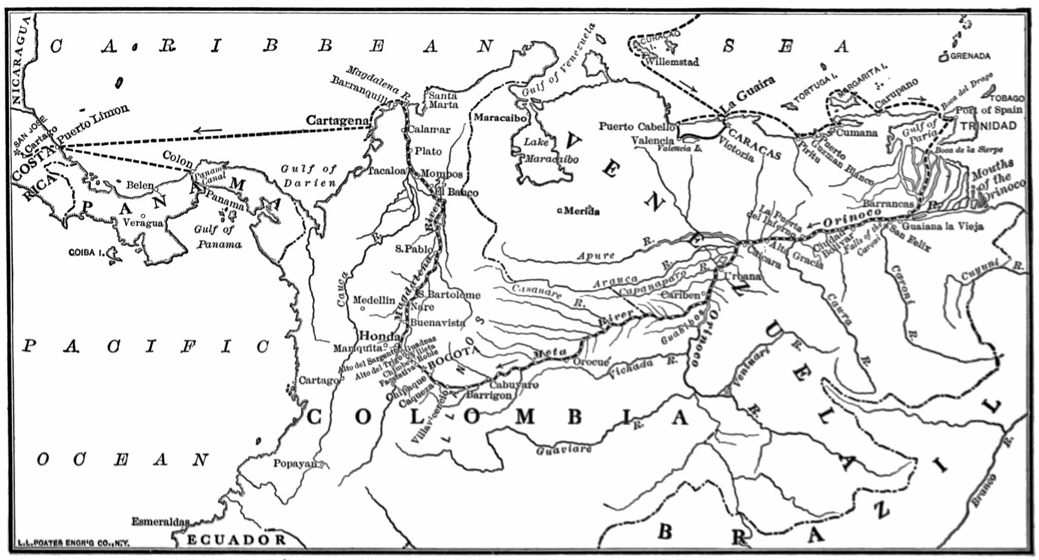 As for the writer, he had no fixed plan, and for this reason he had not even thought of making out an itinerary. He would go to Florida to take up again a line of travel that had been interrupted some decades before. He had always been interested in the lives and achievements of the early Spanish discoverers and conquistadores, and had, in days gone by, followed in the footsteps of Narvaez and de Soto, of Cabeza de Vaca and Coronado, Fray Marcos de Niza, and Hernando Cortes. And now that he had the opportunity, it occurred to him that he could do nothing better or more profitable than make a reality what had been a dream from boyhood. He would visit the islands and lands discovered by the immortal “Admiral of the ocean sea” and follow in the footsteps of the conquistadores in Tierra Firme. He would explore the lands first made known by Balboa, and Quesada, and Belalcazar and rendered famous by the prowess of the Almagros and the Pizarros. He would visit the homes of the Musicas, the Incas, and the Ayamaras, wander among the Cordilleras from the Caribbean Sea to Lake Titicaca and beyond, and follow in the wake of Diego de Ordaz and Alonzo de Herrera on the broad waters of the Orinoco and in that of Pedro de Orsua and Francisco de Orellana in the mighty flood of the Amazon. [4]