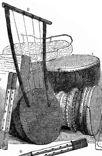 Music, like everything else connected with India, is invested with divine attributes. From the sacred Veda was derived the Upaveda, or subsidiary Veda of the Gandharbas, the heavenly choristers. The art was communicated to mortals by Sarasvati, the consort of Brahma. She, as before stated, is the patroness of the fine arts, the goddess of speech. Their son, an ancient lawgiver and astronomer, invented the Víná. The first inspired man, Bherat, invented the Drama.