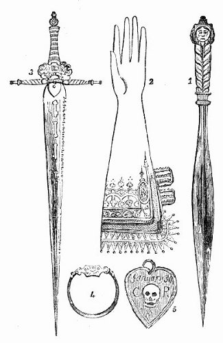 The weapon which forms the subject of the woodcut is a dagger of the time of Philip and Mary, ornamented with engraving. After being thrust into a person, by pulling a little catch, it is made to open within him, and the prolongation of the blade allows means for a second blow. The two small hooks at the inner side of the two blades would admit of the dagger being thrust deeper in, but would prevent its being drawn out.