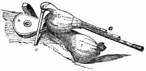 The instrument sketched forms one of the curiosities in the splendid museum of the late Sir S. R. Meyrick, and is a singular instance of that refinement of cruelty which is too prominent a characteristic of the sixteenth century. It is a weapon for throwing poisoned needles among a crowd. Where the lid at the top is seen lifted up, is the chamber in which the needles are kept stuck into a cork at the bottom. On the opposite side a needle is seen put through a hole in a strong spring, held in its place by a catch above, which, when pressed by the thumb disengages it and ejects the needle with considerable force. As the fore-finger goes through the centre ring, and the thumb is at the top, the weapon is almost entirely concealed by the hand. The spring can be adjusted by a screw at the side. This cruel instrument was used by men on horseback, or from a window, and as the needles were poisoned, many painful injuries must have been inflicted without the sufferers being able to discover by whom their wounds were caused.