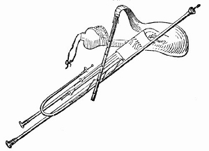 The music of the Hindoos includes eighty-four modes, each supposed to have a peculiar expression, capable of moving some particular sentiment or affection. The modes take their denomination from the seasons, or from the hours of day or night. Musical composition is supposed capable of adaptation to the different periods of the day, and therefore its provisions are regulated by the hours. The ideas of the Hindoos on music, as promoting the pleasures of imagination, may be inferred from the names applied by ancient authors to their musical treatises. One is called Rágárnava, the Sea of the Passions; another, Rágaderpana, the Mirror of Modes; and a third, Sóbhavinóda, the Delight of Assemblies; a fourth, Sangítaderpana, the Mirror of Song; and another, Rágavibódha, the Doctrine of Musical Modes. Some of these works explain the law of musical sounds, their divisions and succession, variations of scales by [Pg 684] temperament, and the enunciation of modes; besides a minute description of the different vínás (lute), and the rules for playing them. This is a fretted instrument of the guitar kind, usually having seven wires or strings, and a large gourd at each end of the finger-board. Its extent is two octaves, and its invention is attributed to Náredá, the son of Brahma. There are many varieties, named according to the number of their strings. Of one of them we give an engraving below.