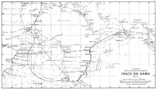 Lisbon to the Cape Verde Islands, p. 186; the Voyage across the Southern Atlantic, p. 186; doubling the Cape, p. 192; along the East Coast of Africa, p. 193; across the Arabian Sea, p. 198; the voyage home, p. 199. |