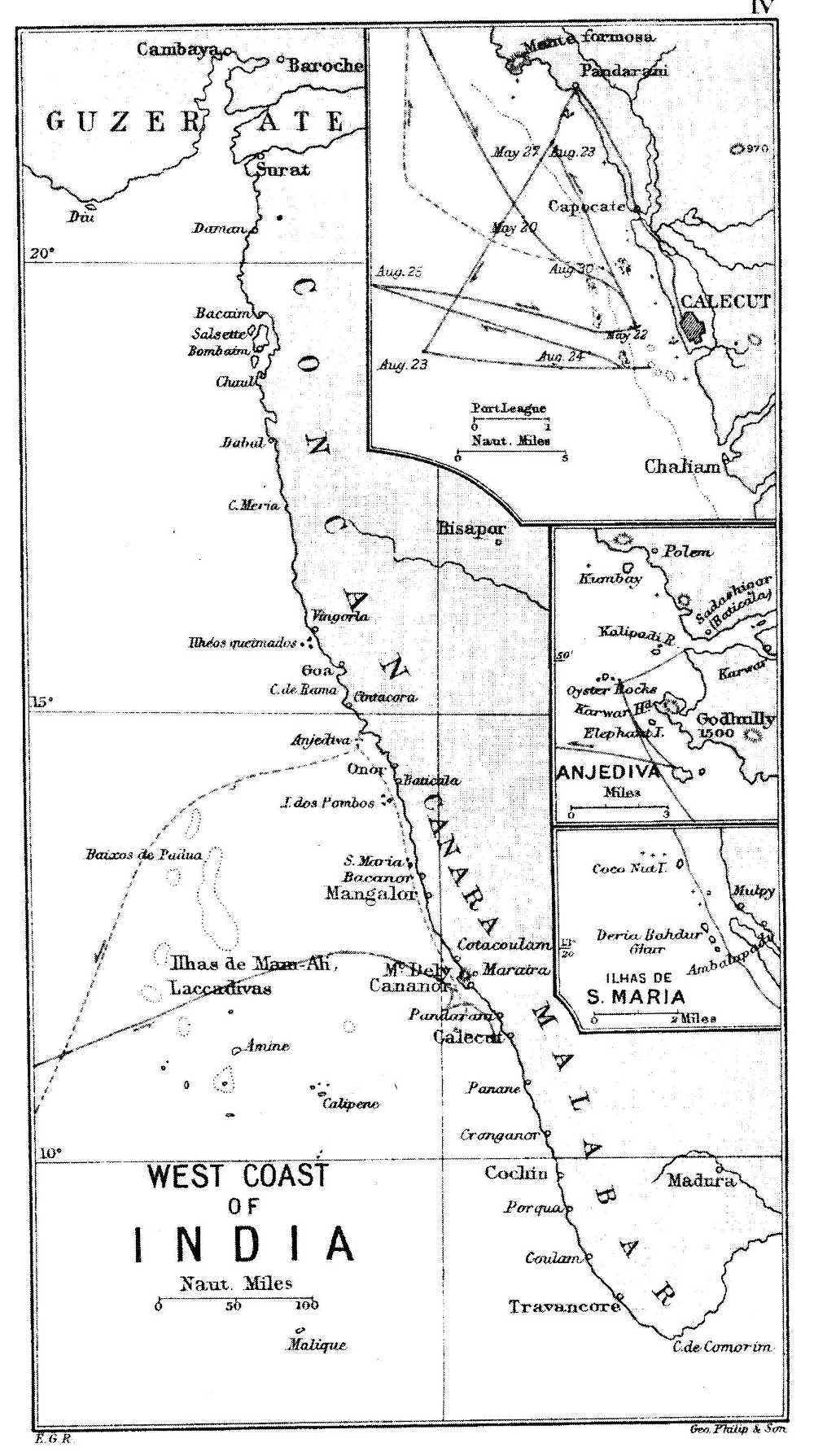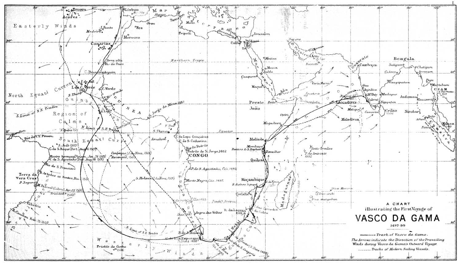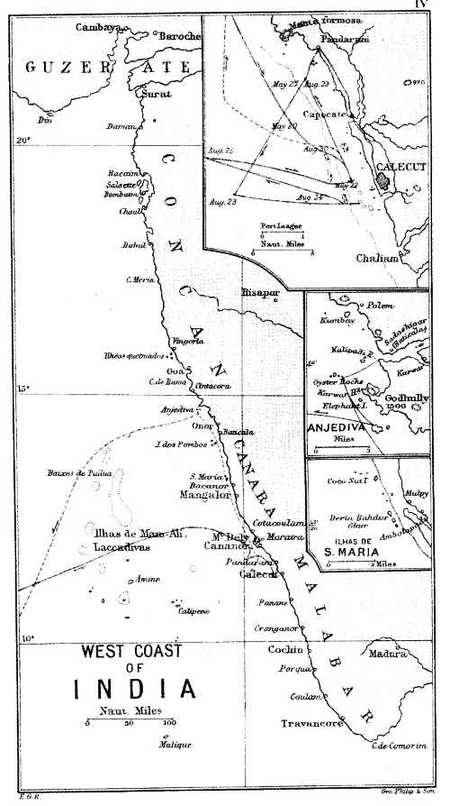 [447] Vasco da Gama thus took 24 days to cross from Melinde to India. Cabral, João da Nova, Estevão da Gama and Affonso de Albuquerque effected this passage in from 15 to 18 days. They crossed in August, when the S.-W. monsoon blows freshly.
