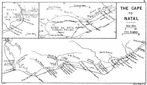 [433] Modern sailing vessels do much better. The passage from São Thiago to the Cape by way of Trinidad (5,140 miles) is made on an average in forty-six days, being a daily run of 125 miles, as compared with 54 miles daily, with which we have credited Vasco da Gama (see the Table at the end of this Appendix).