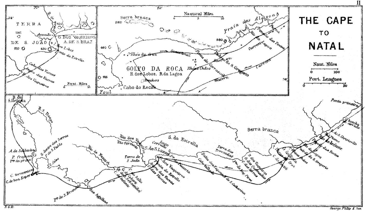 [457] Charts on a larger scale, but of a later date, are available, and enable us to trace the physical features of the coast, but their nomenclature is not always that of the original discoverers. Nor are we so fortunate as to possess such full descriptions of the coast as are to be found in the “Africa Pilot”, for the Esmeraldo de Situ Orbis (1505) of the famous Duarte Pacheco Pereira stops short at the Rio de Infante; whilst works such as Linschoten’s Itinerarium ofte Schipvaert, belong either to a much later epoch, or are of too general a nature to prove of use when attempting to identify the more obscure place-names. I think it was Admiral Ignacio da Costa Quintella, the author of the Annaes da marinha Portugueza, who regretted that the task of writing the history of Portuguese exploration should have devolved almost exclusively upon landsmen, who neglected to give satisfactory accounts of the routes followed by the early navigators. This regret we fully share.