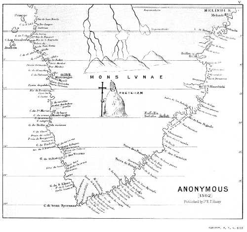 [484] In 1482 Diogo Cão discovered the Congo. We ought evidently to read 1488, for the Congo is only 1,240 leagues from Lisbon, whilst the 1,885 leagues actually carry us to the Rio do Infante. The name is thus spelt in this document as if the river had been named in honour of Prince Henry, and not after João Infante, the companion of Dias.