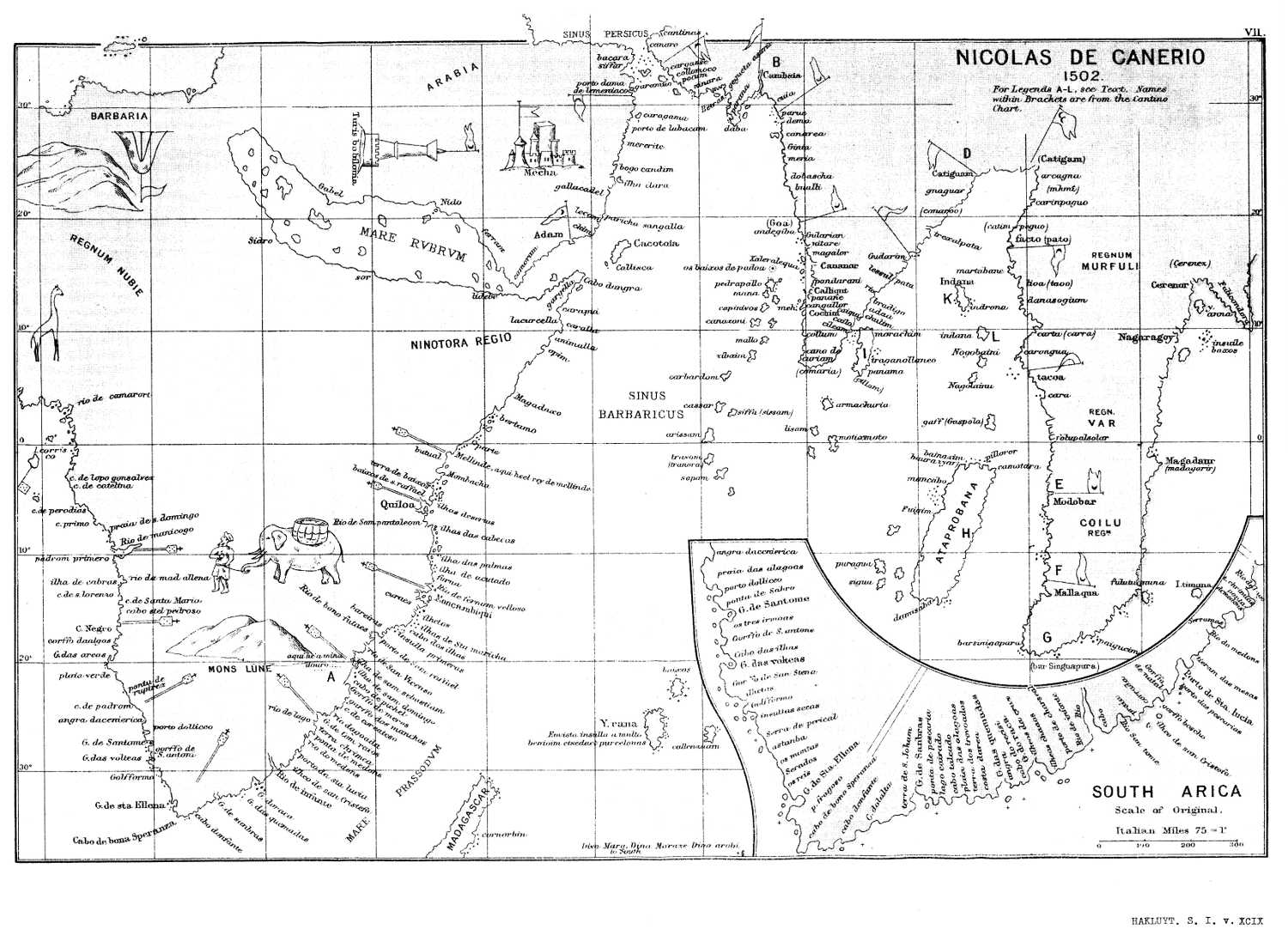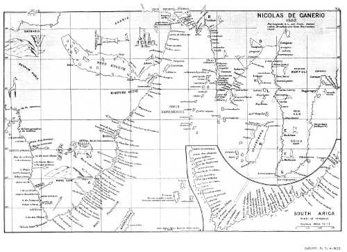 [440] On Canerio’s chart St. Helena’s Bay is placed 32° 30´ S., the true latitude being 32° 40´ S. Cantino, whose outline is far more correct places the Bay in 31° S.