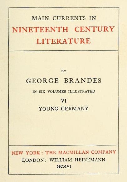 The author's intention, as explained in the first lines of his work, was, by means of the study of certain main groups and main movements in European literature, to outline a psychology of the first half of the nineteenth century. The year 1848, which, as a historical turning-point, marks a conclusion for the time being, was indicated as the point to which he intended to pursue his subject. The six groups which, according to the original plan, have been portrayed, are, the French Emigrant Literature, German Romanticism, the French Reaction, English Naturalism, French Romanticism, and Young Germany. Each one of the six parts of the work has in the course of years either been re-written or revised.