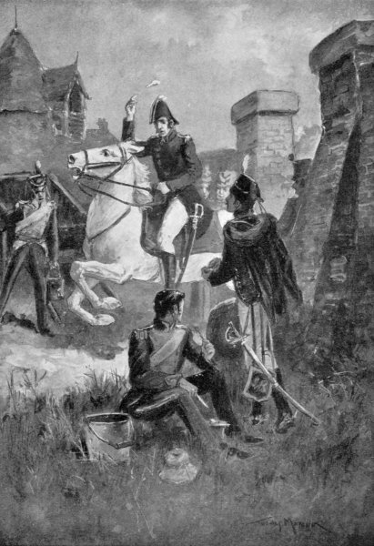 From this passive scene in the evening of his days let us turn to the more stirring days of the storming of Badajoz for our final portrait of the Duke, for it is in the field that we like to remember him. The glimpse is afforded us by Robert Blakeney, one of the boy heroes of the Peninsular War. “I galloped off,” he writes, “to where Lord Wellington had taken his station: this was easily discerned by means of two fireballs10 shot out from the fortress at the commencement of the attack, which continued to burn brilliantly along the water-cut which divided the 3rd from the other divisions. Near the end of this channel, behind a rising mound, were Lord Wellington and his personal staff, screened from the enemy’s direct fire, but within range of shells. One of his staff sat down by his side with a candle to enable the general to read and write all his communications and orders relative to the passing events. I stood not far from his lordship. But due respect prevented any of us bystanders from approaching so near as to enable us to ascertain the import of the reports which he was continually receiving; yet it was very evident that the information which they conveyed was far from flattering; and the recall on the bugles was again and again repeated. But about half-past eleven o’clock an officer rode up at full speed on a horse covered with foam, and announced the joyful tidings that General Picton had made a lodgment within the castle by escalade, and had withdrawn the troops from the trenches to enable him to maintain his dearly purchased hold. Lord Wellington was evidently delighted, but exclaimed, ‘What! abandon the trenches?’ and ordered two regiments of the 5th Division instantly to replace those withdrawn. I waited to hear no more, but, admiring the prompt genius which immediately provided for every contingency, I mounted my horse.”