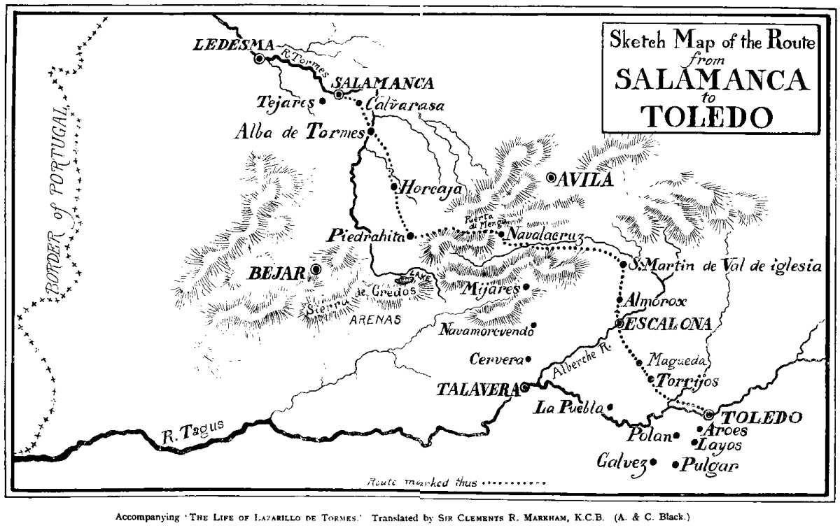 [14] There was a huge mass of granite rudely carved in the shape of an animal, which had been on the bridge from time immemorial; and which Lazarillo thought was like a bull. Its great weight was considered a danger, and it was removed about thirty years ago. It is now in the vestibule of the cloister of San Domingo at Salamanca, but without a head.