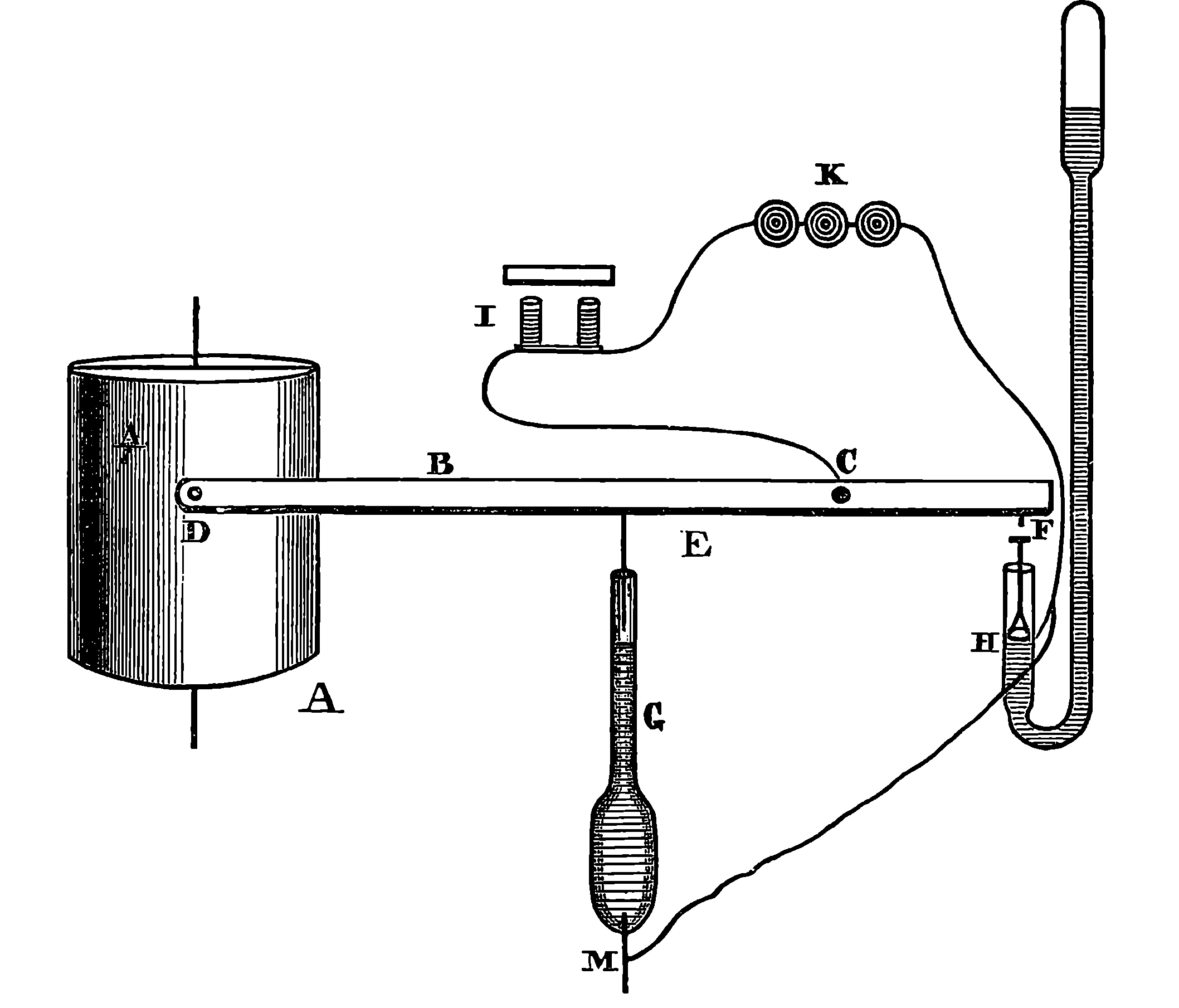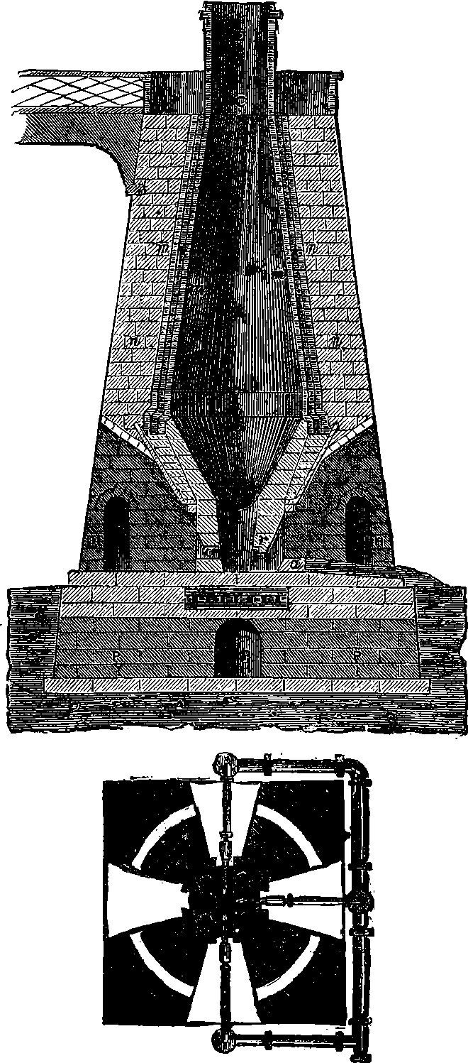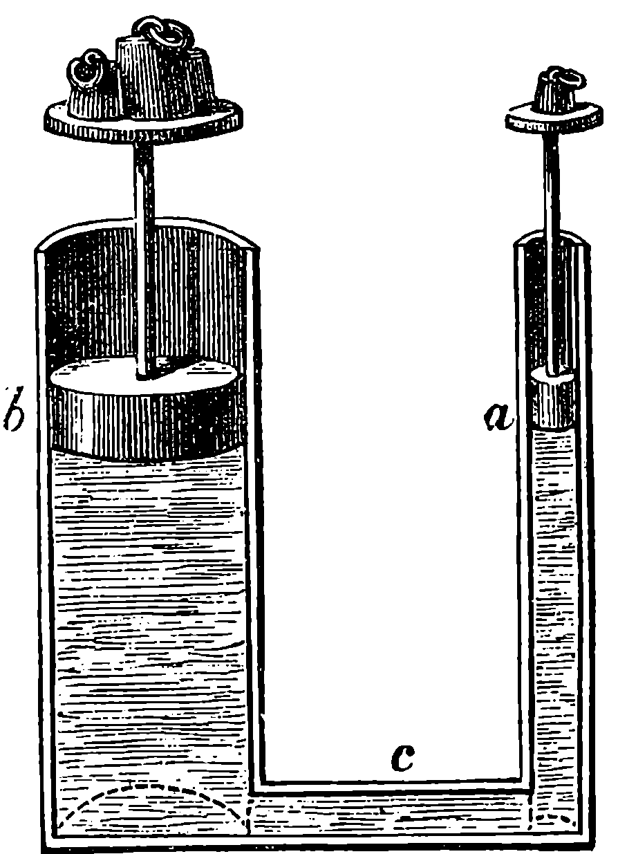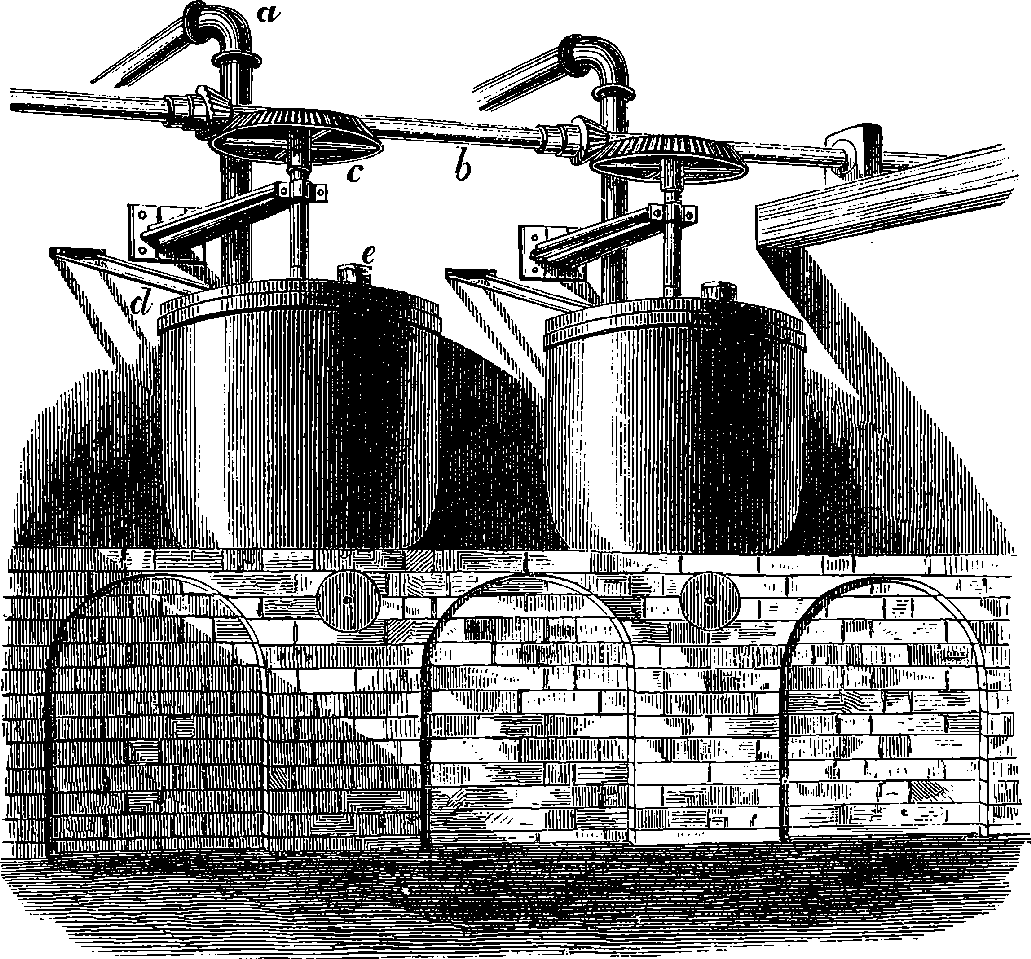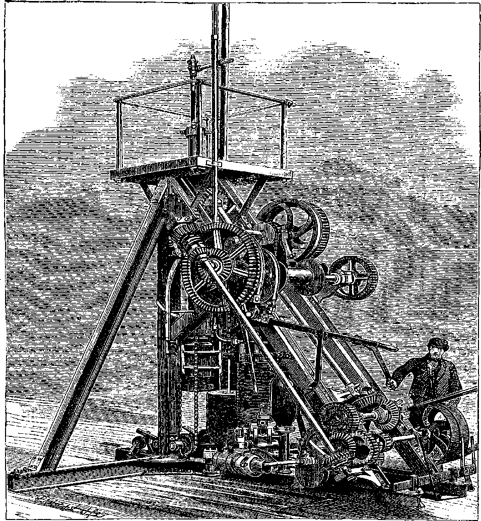 Dr. Joule arranged paddles of brass or iron, so that they could turn freely in a circular box containing water or quicksilver. From the sides of the box partitions projected inwards, which contained openings that permitted the divided arms of the paddle to pass, and preventing the liquid from 805moving en masse, thus caused a churning action when the paddle was turned. Now, every one who has worked a rotatory churn knows that a considerable resistance is offered to this action; but every one does not know that under these circumstances the liquid becomes warmer. It was Dr. Joule’s object to discover how much the temperature of his liquid was raised by a measured quantity of work. He used very delicate thermometers, and had to take a number of precautions which need not here be described; and he obtained the definite quantity of work by the descent of a known weight through a known distance, a cord attached to the weight being wound on a drum, which communicated motion to the paddle. The experiments were conducted with varying circumstances, to avoid chances of error, and were repeated very many times until uniform and consistent indications were always obtained. The result of the experiments showed that 772 units of work (foot-pounds) furnished heat which would raise the temperature of 1 lb. of water from 32° to 33° F., which is the unit of heat. This number, 772, is a constant of the greatest importance in scientific and practical calculations, and is called “the mechanical equivalent of heat.” The amount of work it represents is sometimes called a “Joule,” and is always represented in algebraical formulæ by “J.” Mr. Joule’s first paper appeared in 1843, and soon afterwards various branches of the subject of “The Equivalence and Persistence of Forces” were taken up by a number of able men, who have advanced its principles along various lines of inquiry. Among the most noted contributors to this question we find the names of Sir William Thomson, Helmholtz, James Thomson, Rankin, Clausius, Tait, Andrews, and Maxwell.