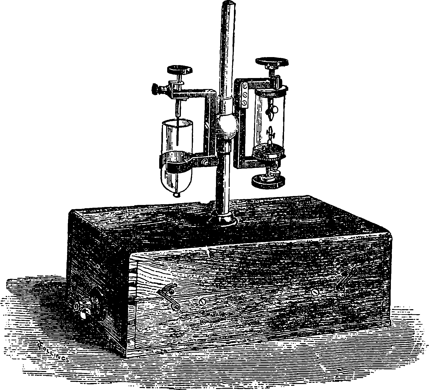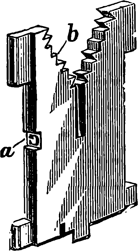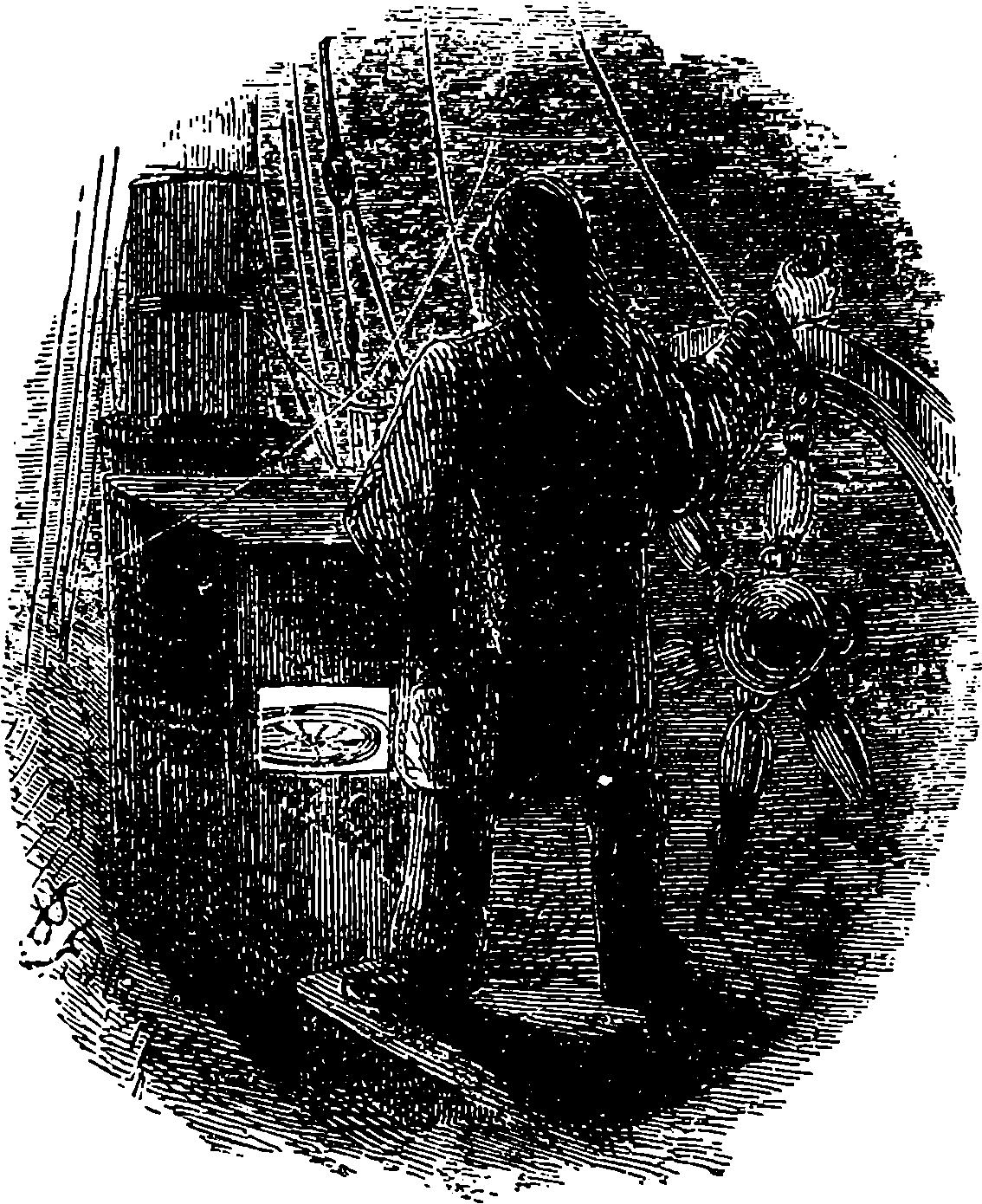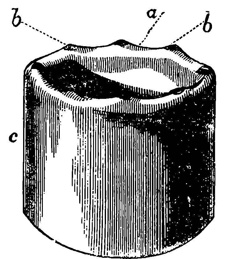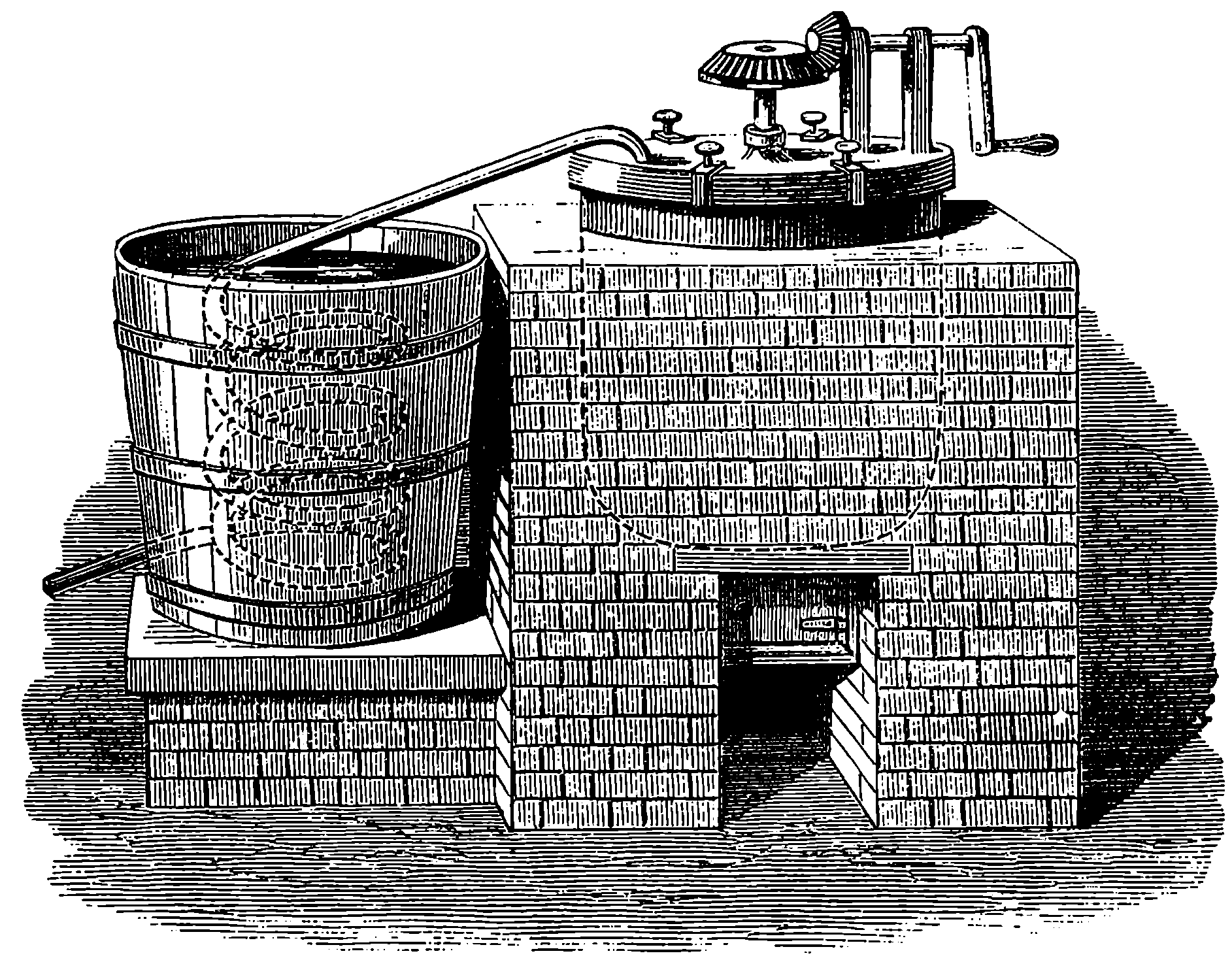 Dr. Joule arranged paddles of brass or iron, so that they could turn freely in a circular box containing water or quicksilver. From the sides of the box partitions projected inwards, which contained openings that permitted the divided arms of the paddle to pass, and preventing the liquid from 805moving en masse, thus caused a churning action when the paddle was turned. Now, every one who has worked a rotatory churn knows that a considerable resistance is offered to this action; but every one does not know that under these circumstances the liquid becomes warmer. It was Dr. Joule’s object to discover how much the temperature of his liquid was raised by a measured quantity of work. He used very delicate thermometers, and had to take a number of precautions which need not here be described; and he obtained the definite quantity of work by the descent of a known weight through a known distance, a cord attached to the weight being wound on a drum, which communicated motion to the paddle. The experiments were conducted with varying circumstances, to avoid chances of error, and were repeated very many times until uniform and consistent indications were always obtained. The result of the experiments showed that 772 units of work (foot-pounds) furnished heat which would raise the temperature of 1 lb. of water from 32° to 33° F., which is the unit of heat. This number, 772, is a constant of the greatest importance in scientific and practical calculations, and is called “the mechanical equivalent of heat.” The amount of work it represents is sometimes called a “Joule,” and is always represented in algebraical formulæ by “J.” Mr. Joule’s first paper appeared in 1843, and soon afterwards various branches of the subject of “The Equivalence and Persistence of Forces” were taken up by a number of able men, who have advanced its principles along various lines of inquiry. Among the most noted contributors to this question we find the names of Sir William Thomson, Helmholtz, James Thomson, Rankin, Clausius, Tait, Andrews, and Maxwell.