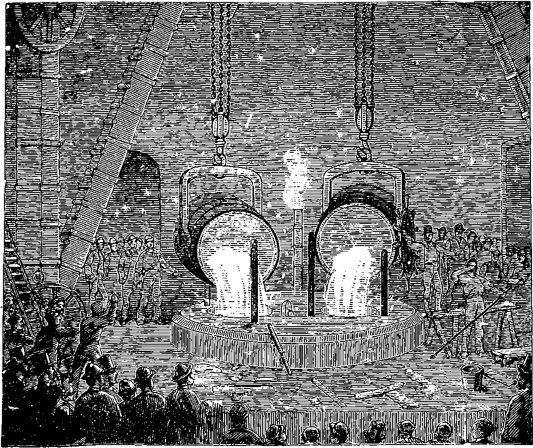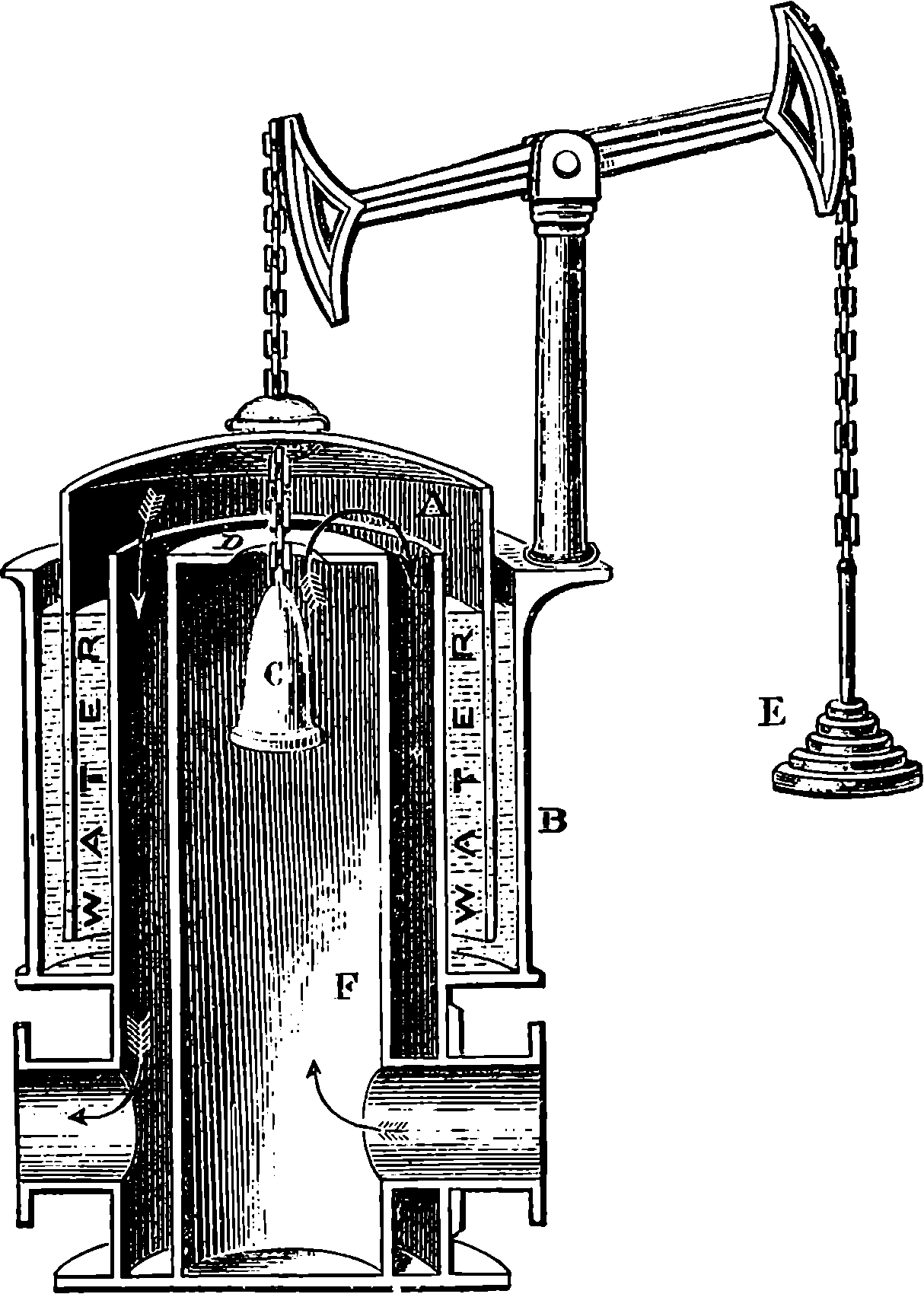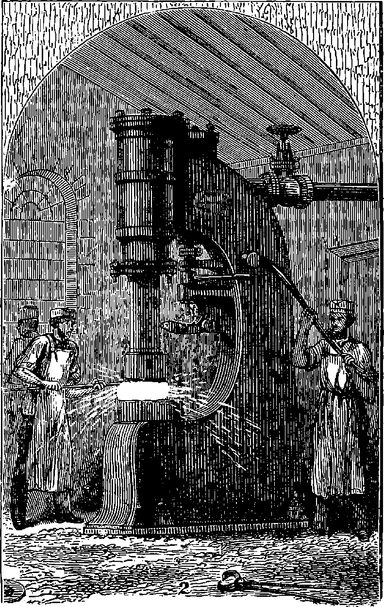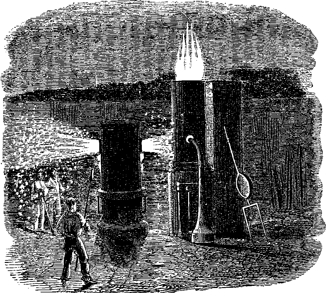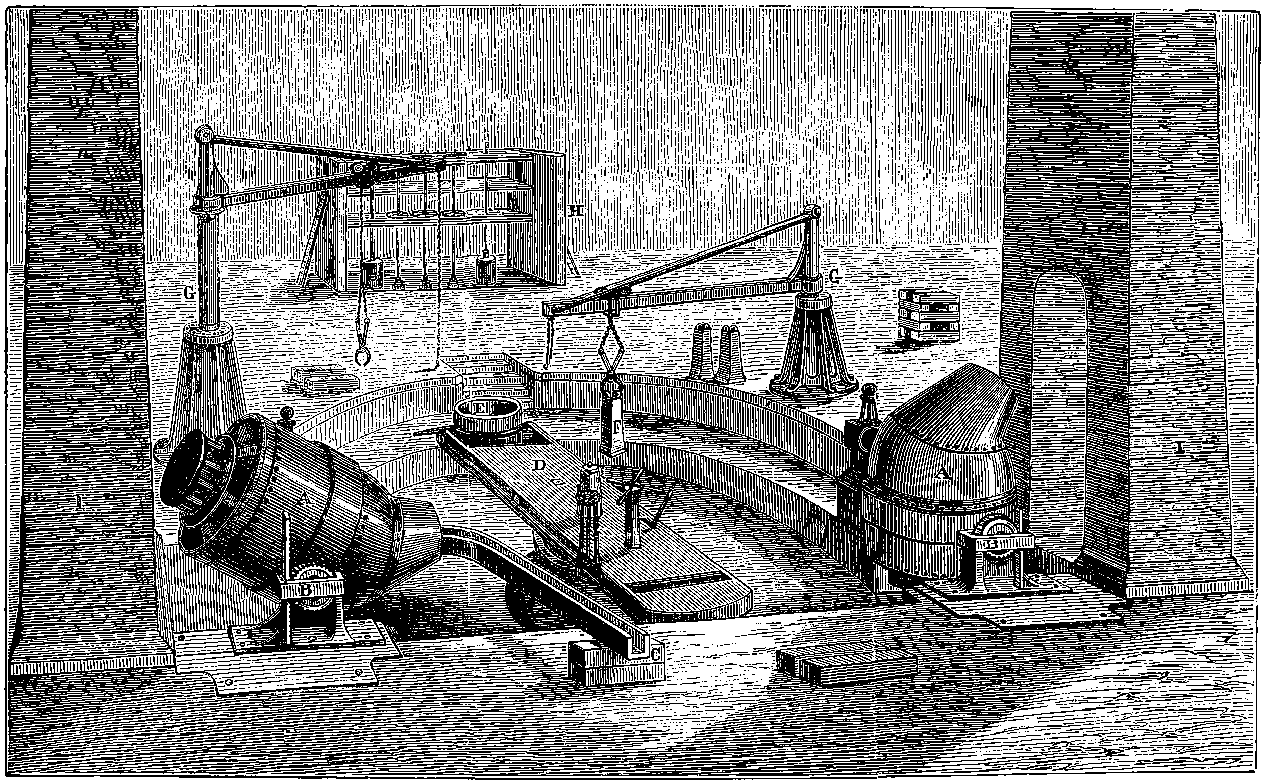 Before we proceed to give an indication of one of Dr. Joule’s methods of making this determination, we may point out that if a weight be raised a certain height, the work which is done in raising it will be given out by the weight in its descent. If you carry a 1 lb. weight to the top of the London Monument, which is 200 ft. high, you perform 200 units of work. When the weight is at the top, the work is not lost; for let the weight be attached to a cord passing over a pulley, and it will, as it descends, draw up to the top another 1 lb. weight.[21] If you drop the weight so that it falls freely, it descends with a continually increasing velocity, strikes the pavement, and comes to rest. Still your work is not lost. The collision of the weight and the pavement develops heat, just as in the case of the experiment depicted on page 168, but to a less degree—the increase of temperature might not be sensible to the touch, but could be recognized by delicate instruments. Your work, then, has now changed into the form of heat—the weight and the pavement are hotter than before. This heat is carried off by contiguous substances. But still your work is not lost, for it has made the earth warmer. The heat, however, soon flows away by radiation from the earth, and is diffused into space. The final result of your work is, then, that a certain measurable quantity of heat has been sent off into space. Is your work now finally lost? Not so: in reality, it is only diffused throughout the universe in the form of radiant heat of low intensity. Yet it is lost for ever for useful purposes; for from this final form of diffused heat there is no known or conceivable process by which heat can be gathered up again.