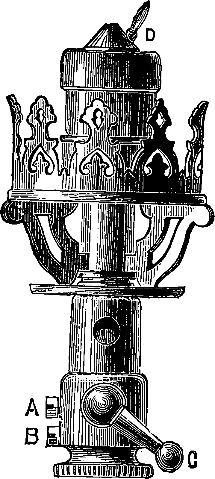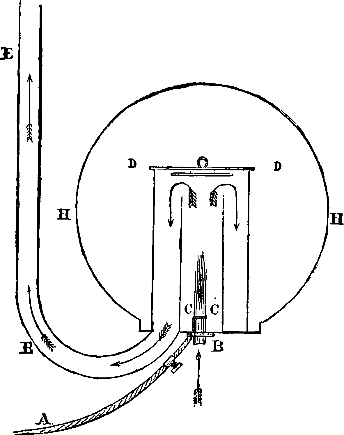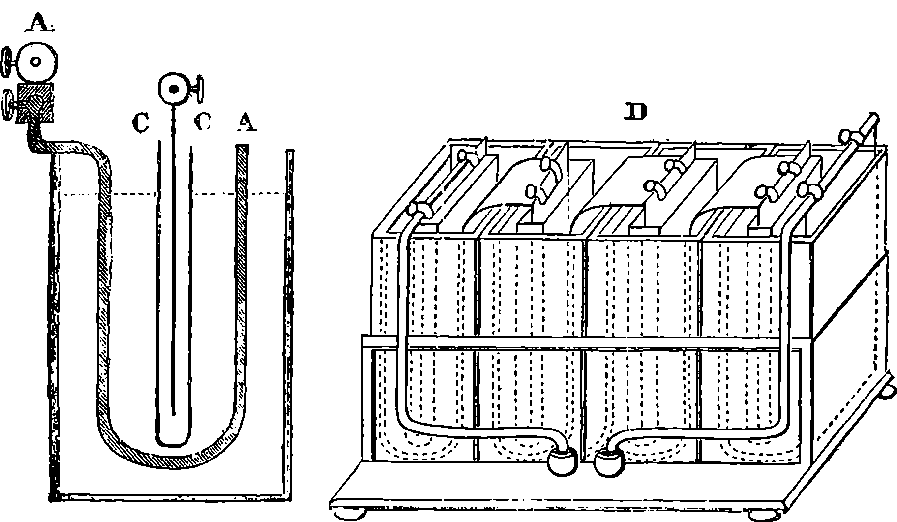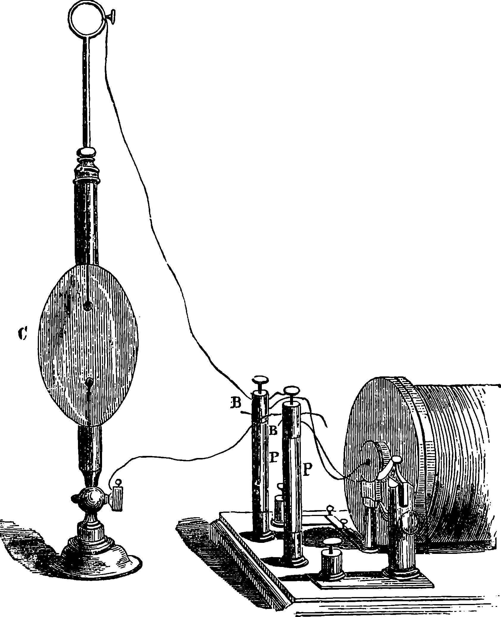Before we proceed to give an indication of one of Dr. Joule’s methods of making this determination, we may point out that if a weight be raised a certain height, the work which is done in raising it will be given out by the weight in its descent. If you carry a 1 lb. weight to the top of the London Monument, which is 200 ft. high, you perform 200 units of work. When the weight is at the top, the work is not lost; for let the weight be attached to a cord passing over a pulley, and it will, as it descends, draw up to the top another 1 lb. weight.[21] If you drop the weight so that it falls freely, it descends with a continually increasing velocity, strikes the pavement, and comes to rest. Still your work is not lost. The collision of the weight and the pavement develops heat, just as in the case of the experiment depicted on page 168, but to a less degree—the increase of temperature might not be sensible to the touch, but could be recognized by delicate instruments. Your work, then, has now changed into the form of heat—the weight and the pavement are hotter than before. This heat is carried off by contiguous substances. But still your work is not lost, for it has made the earth warmer. The heat, however, soon flows away by radiation from the earth, and is diffused into space. The final result of your work is, then, that a certain measurable quantity of heat has been sent off into space. Is your work now finally lost? Not so: in reality, it is only diffused throughout the universe in the form of radiant heat of low intensity. Yet it is lost for ever for useful purposes; for from this final form of diffused heat there is no known or conceivable process by which heat can be gathered up again.